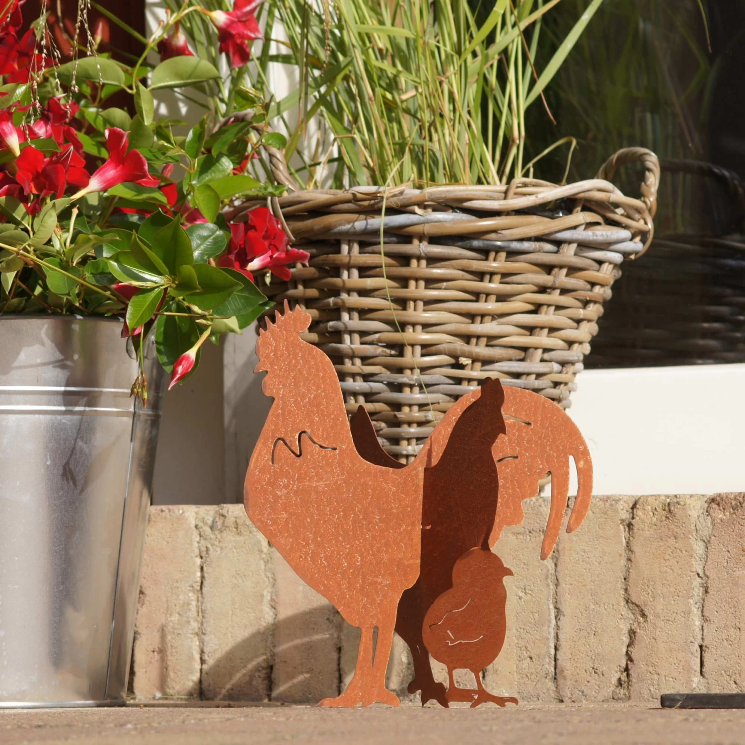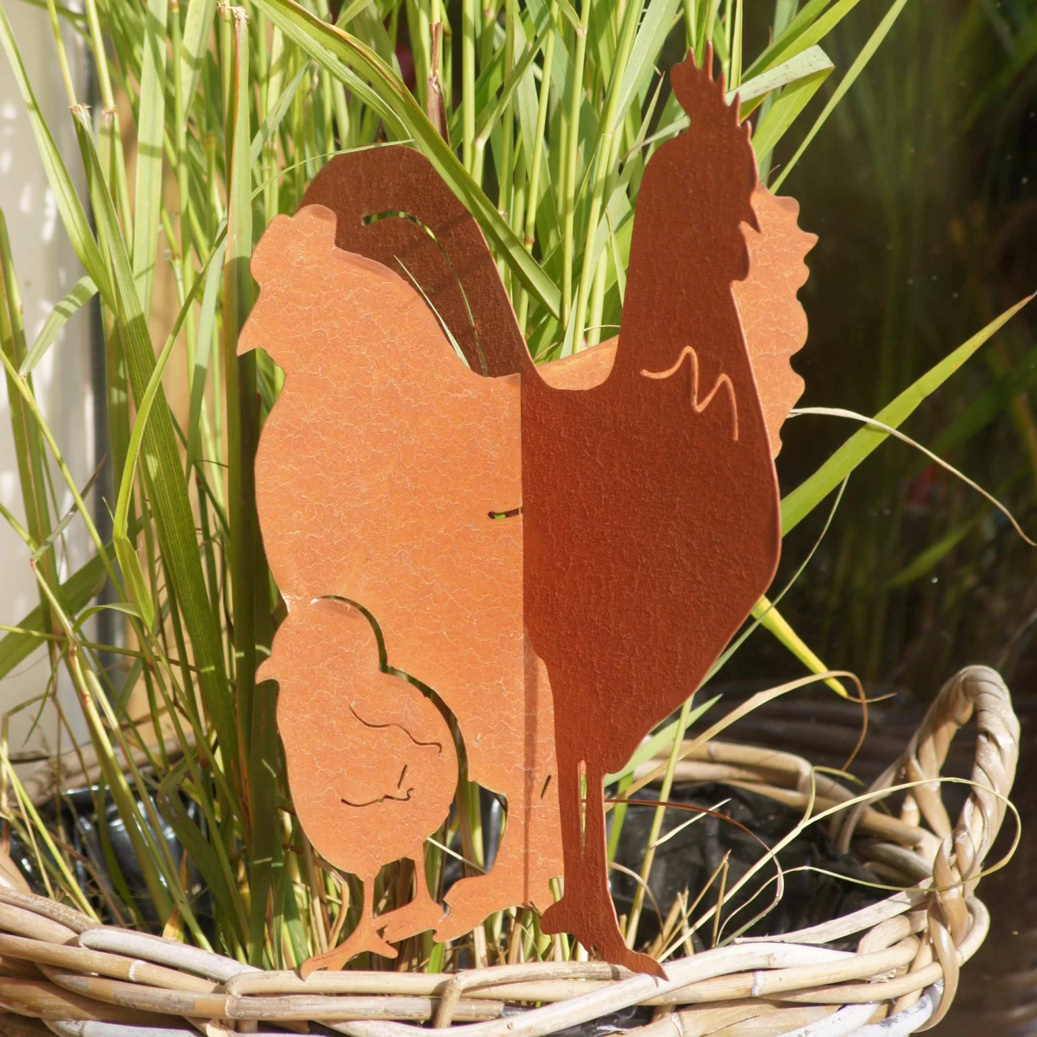 Der Sommer steht vor der Tür und die warmen Tage im Garten können kommen! Machen Sie Ihr Zuhause mit unserem Gartenstecker aus Edelrost noch schöner. Die wunderschöne Hühnerfamilie lässt sich in fast jeder Umgebung integrieren. Die kunstvoll gezeichneten, feinen Formen bringen das gewisse Etwas in Ihren Garten. Die Handhabung der Figur ist kinderleicht. Einfach die Steckelemente zusammenstecken und platzieren. Schon ist Ihr Garten oder Zuhause dekoriert.