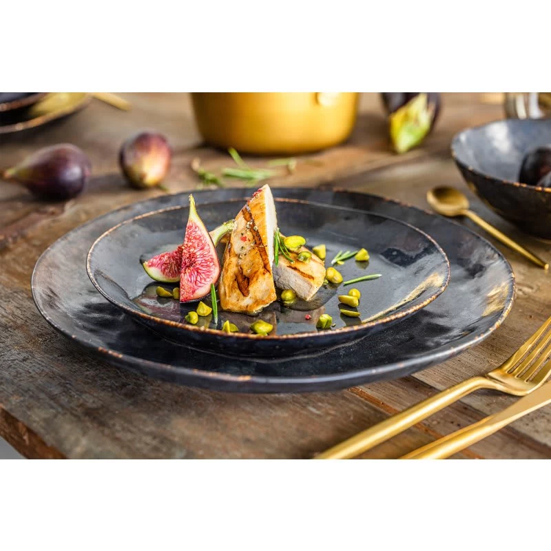 Das Teller Set Tombey der Marke Sänger besticht durch den Farbmix aus Blau und Grau geprägter Maserung in Verbindung mit der unregelmäßig schimmernden Glasur. Beides zusammen erzeugt eine tolle Metalloptik. Dadurch können Sie sich sicher sein, dass Sie zu jedem Anlass stilvoll servieren werden, denn hier haben Sie das richtige Service gefunden.
