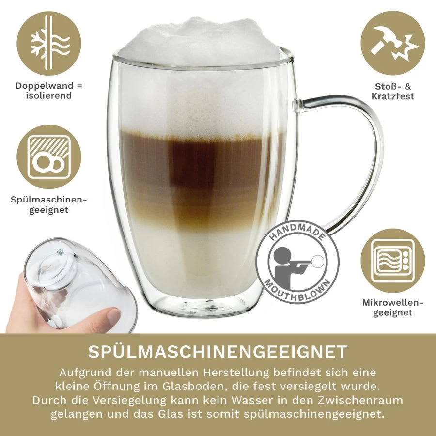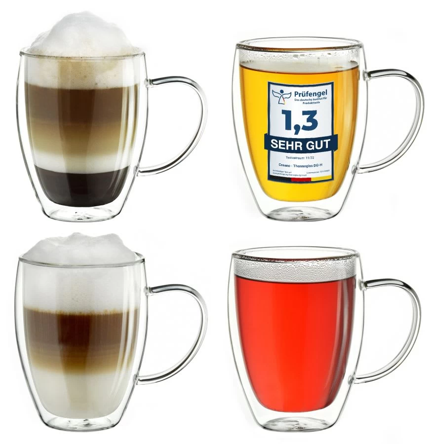 Doppelwandige Trinkgläser mit Henkel und Thermoeigenschaften im hohen Design. Im Angebot finden Sie ein 4er Set mit 400ml Fassungsvermögen
