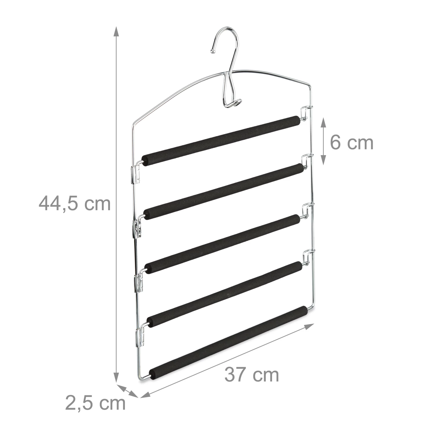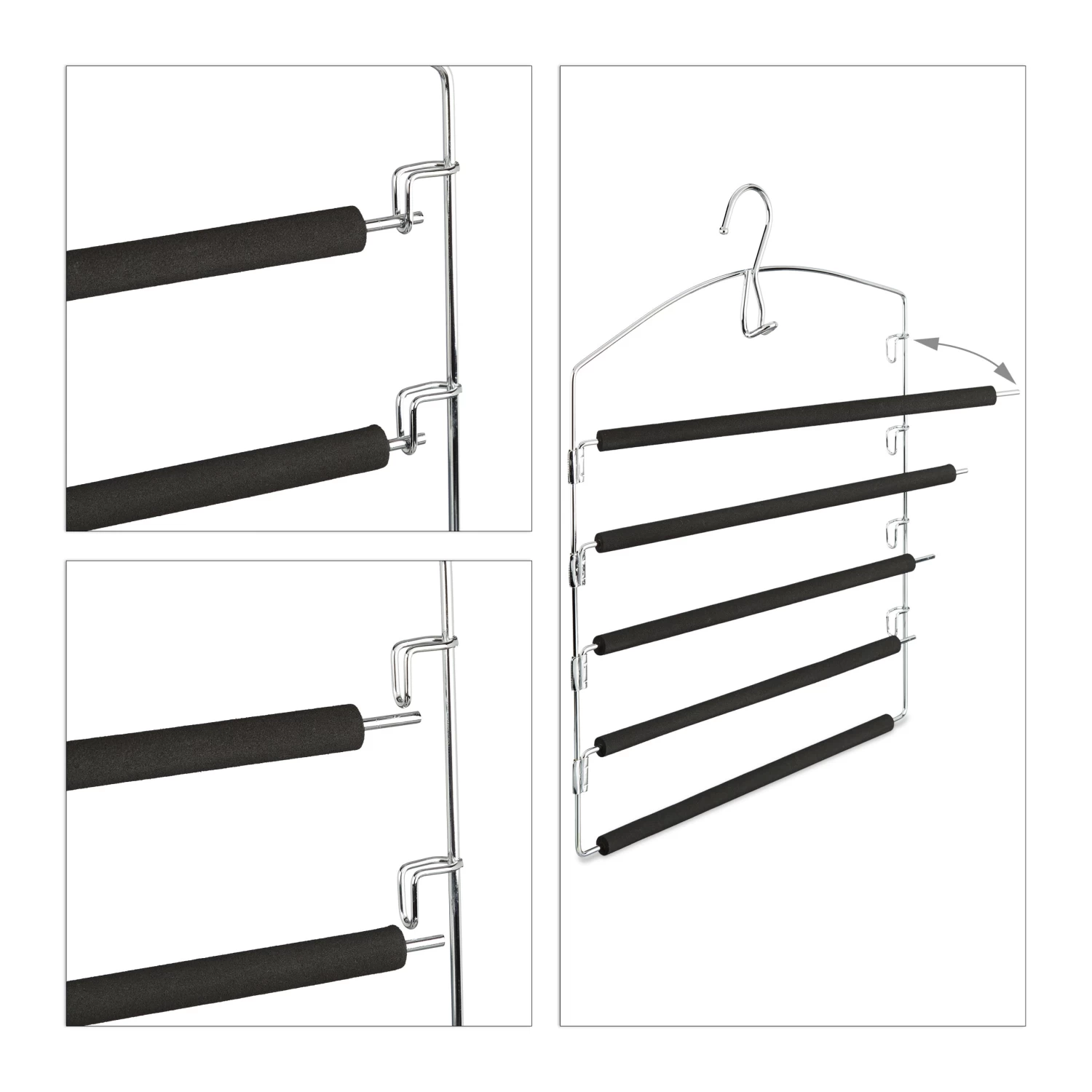 Mit diesem stabilen Mehrfachbügel aus verchromtem Eisen erhalten Sie einen platzsparenden Mitstreiter für Ihren Kleiderschrank. Der Hosenbügel verfügt über 5 Stege, die Sie einzeln herausschwenken können. Das hat den Vorteil, dass Sie für die Nutzung den Hosenkleiderbügel nicht extra aus dem Schrank nehmen müssen. Die Stege sind mit schwarzem Schaumstoff bezogen, der dafür sorgt, dass Ihre Hosen und Röcke nicht verrutschen – praktisch!
