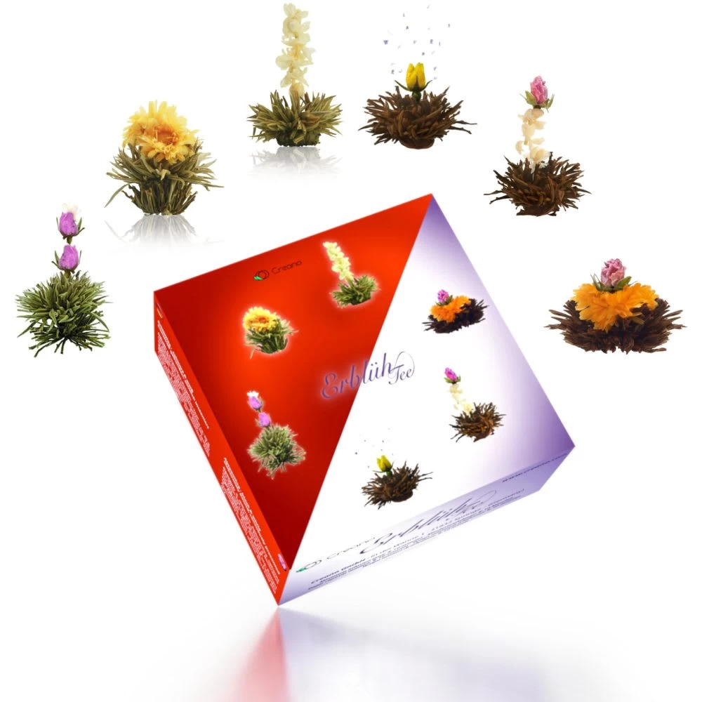 Der ErblühTee bietet dem Genießenden ein außergewöhnliches Erlebnis: Im Innern der Kugel befindet sich eine kunstvoll eingebundene exotische Blüte. Ihr Geheimnis entfaltet die Kugel aber erst, wenn sie in ein Gefäß mit kochend heißem Wasser gegeben wird. Sie beginnt sich langsam zu öffnen und bringt am Ende der Aufgussinszenierung die eingebettete Blüte hervor, die formenreich und farbenprächtig aus ihr emporsteigt. An diesem Tee ist fast alles Handarbeit. Nur wenigen so genannten Meisterbinderinnen ist es vorbehalten, die getrockneten Blätter des Weißen Tees zu einer Kugelform zu binden, denn das Wissen um diese seltene Kunst wird streng behütet. So bleibt der ErblühTee eine wertvolle Rarität Chinas.