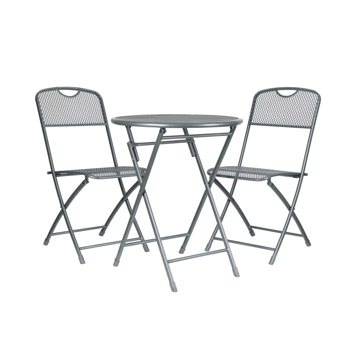 Das robuste Metall ist zusätzlich mit einer Kunststoffummantelung versehen, was die Witterungsbeständigkeit der Möbel erhöht und ihnen ein edles Äußeres verleiht. Die beiden Klappstühle und der passende runde Tisch sind schnell aufgestellt, nehmen nicht viel Platz in Anspruch und lassen sich zum Lagern klein zusammenklappen – ideal zum Verstauen in Keller, Gartenhäuschen, hinter dem Vorhang usw.