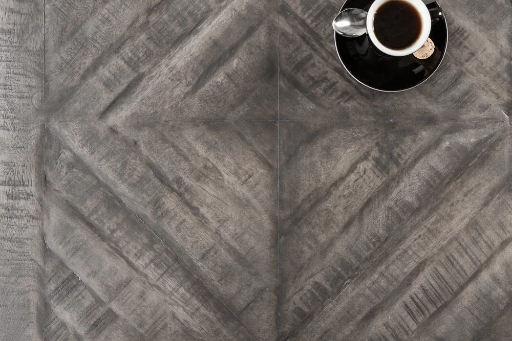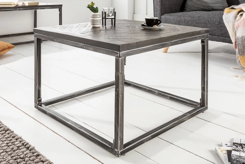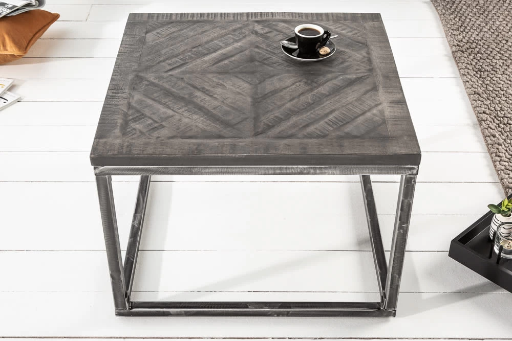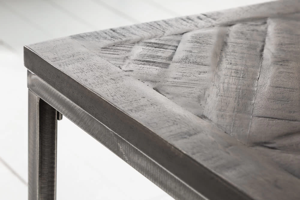 Wenn Sie Ihr Ambiente mit einem ganz besonderen Eyecatcher im Industrial Look ergänzen möchten, ist unser INFINITY HOME Beistelltisch genau die richtige Wahl. Der kompakte Tisch bietet eine besonders gelungene Symbiose aus rauem, intelligent montiertem Metallgestell im geflexten Industrial Finish und massiver Tischplatte aus exotischem Mangoholz mit einem grauen Finish. Das Holz ist in einem mosaikartigen Dielenmuster angeordnet, so wird die tolle Haptik der Oberfläche besonders hervorgehoben.