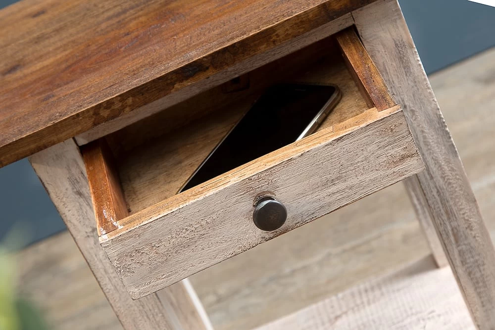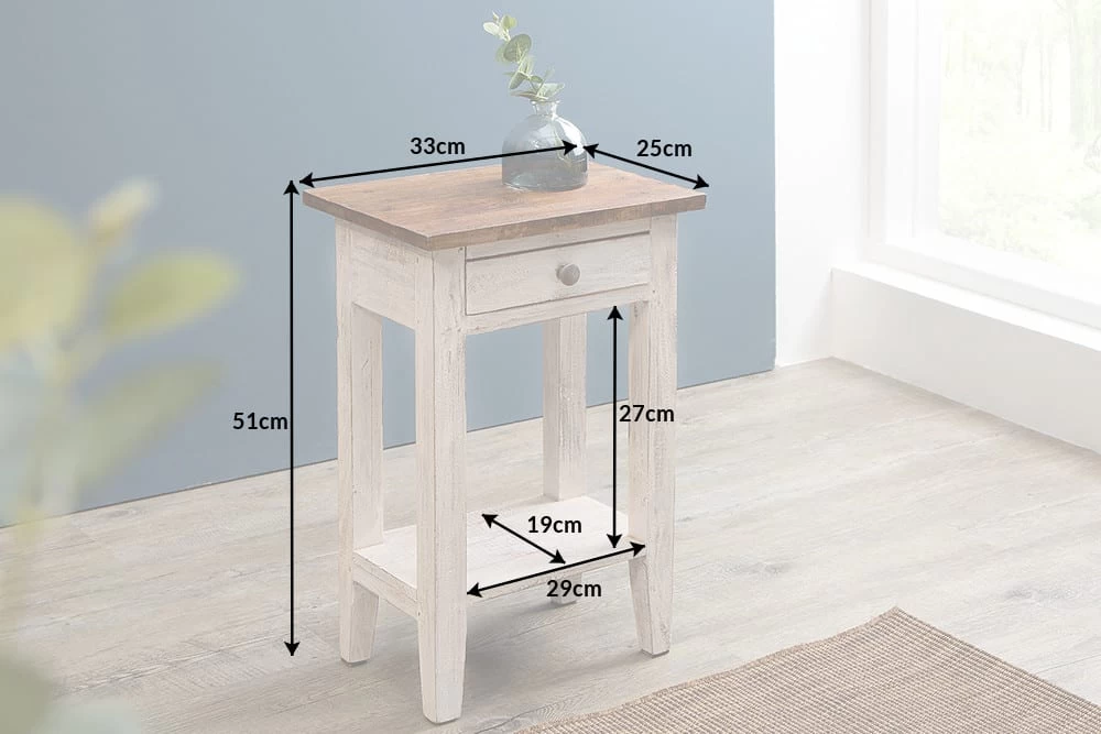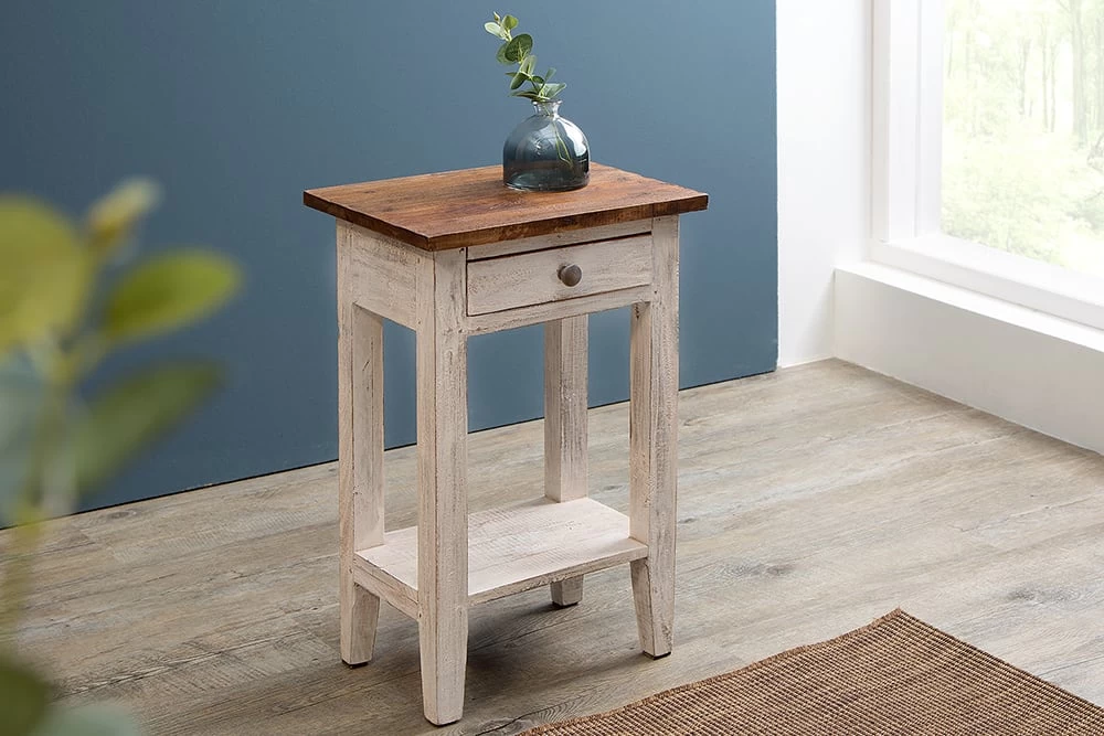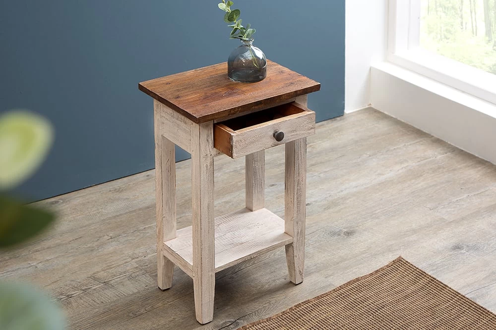 Sie können den charmanten Beistelltisch in jedem beliebigen Raum aufstellen, er wird sich seiner Umgebung immer perfekt anpassen. Auch als Nachtisch macht er eine wundervolle Figur und verleiht Ihrem Schlafzimmer einen nostalgischen Hauch. Die Oberfläche wurde mit sichtbaren Gebrauchsspuren und kleinen Rissen versehen, um einen charakteristischen und somit authentischen Look herzustellen. Dies macht jeden Tisch zu einem wirklichen Unikat.