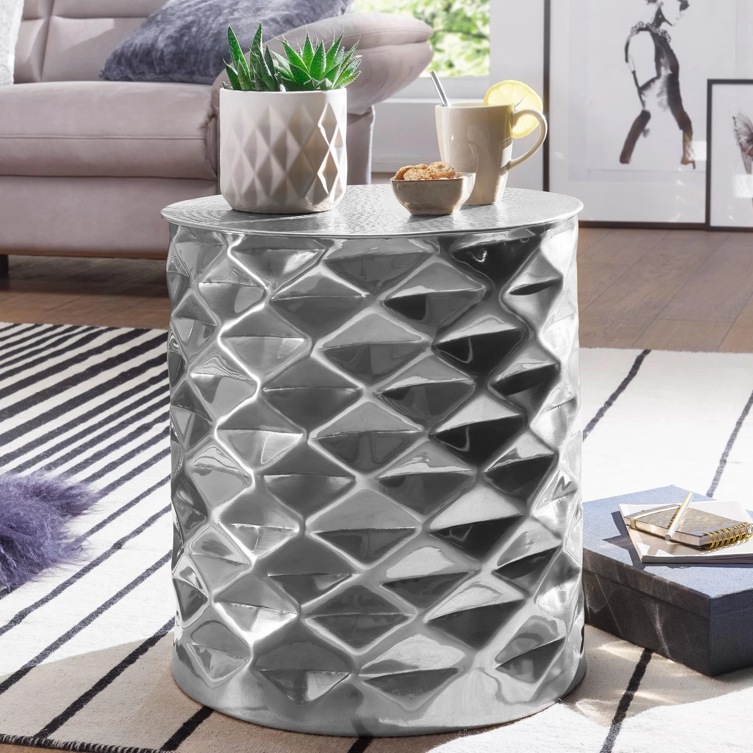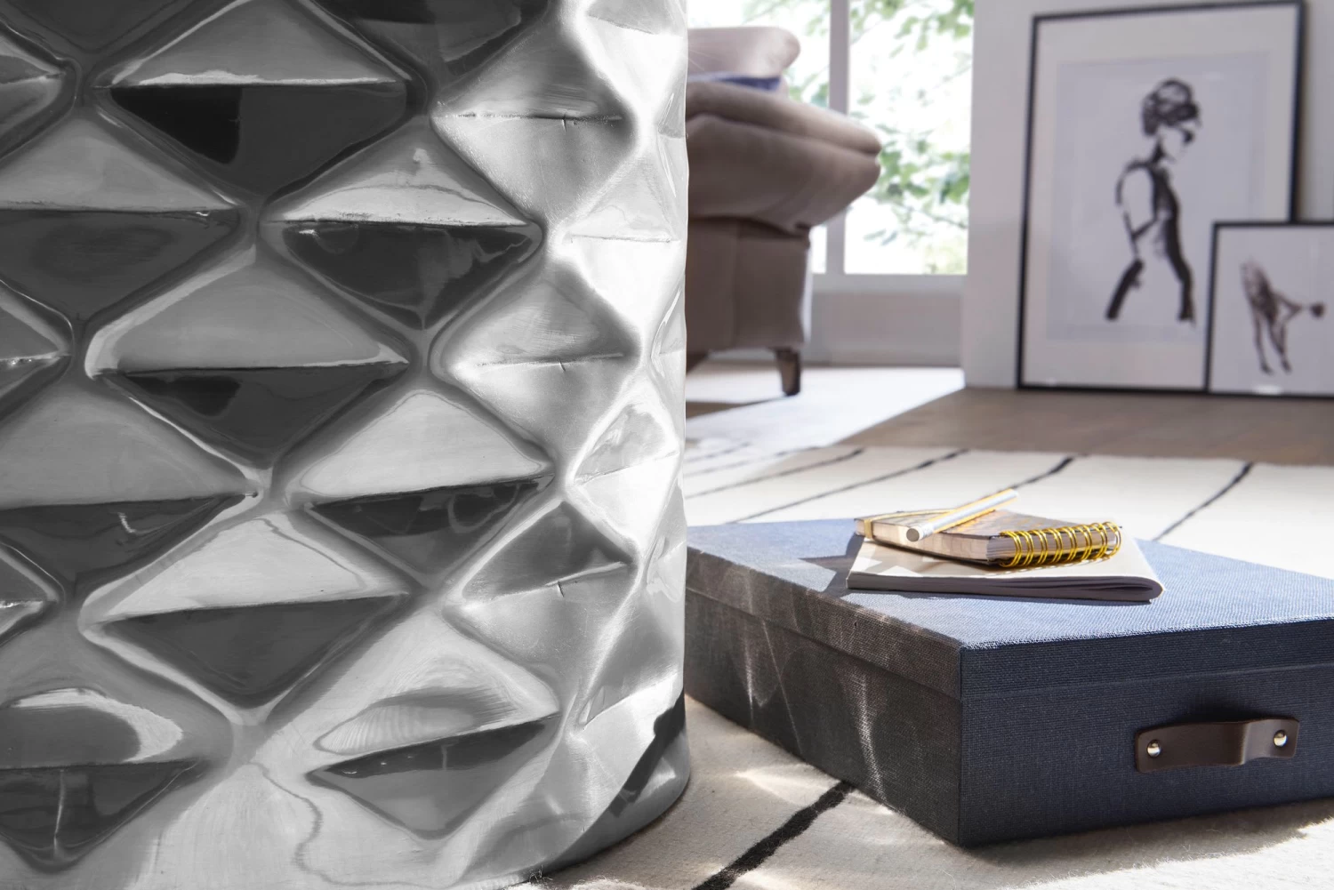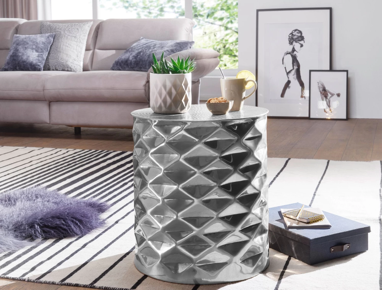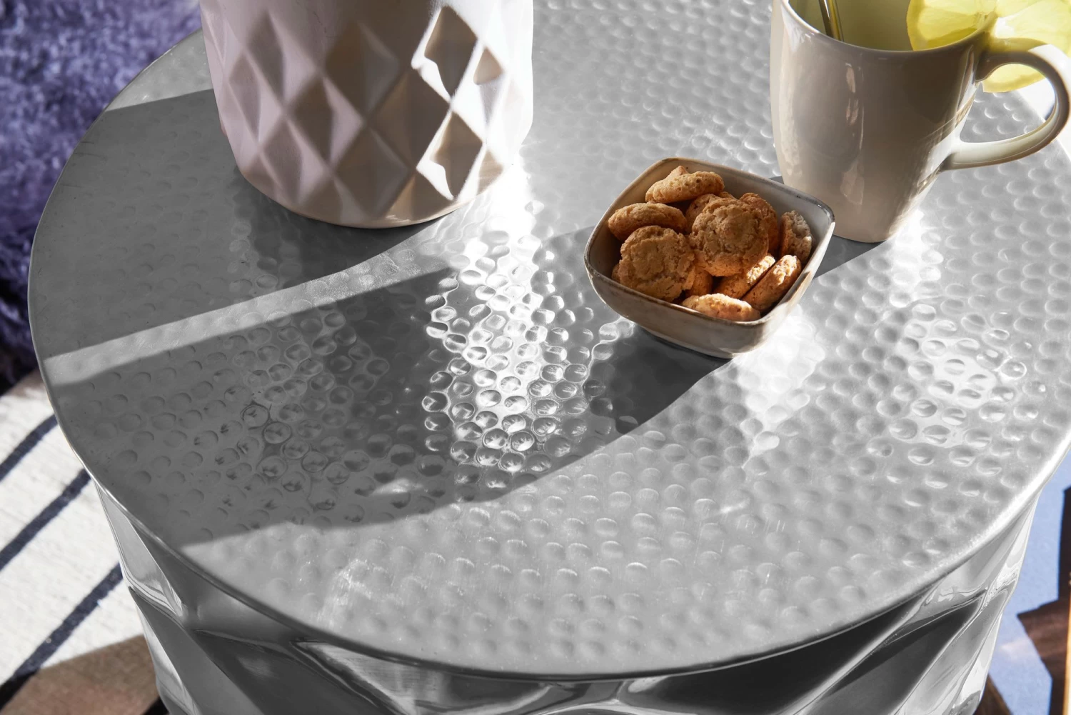 Design Außergewöhnlicher Couchtisch im orientalischen Design Ablagefläche bietet Platz für z. B. Fernbedienung, Zeitschriften & Co. Wunderschöne Hammerschlag-Strukturen machen den Tisch zu einem absoluten Highlight Abmessungen Breite: 43,5 cm Höhe: 48 cm Tiefe: 43,5 cm Durchmesser der Ablagefläche: 43,5 cm Durchmesser der Standfläche: 43 cm Besonderheiten Durch liebevolle Handarbeit ist jeder Tisch ein absolutes Unikat Da die Unterkante nach innen gefalzt ist, werden unschöne Kratzer im Boden vermieden Hohe Stabilität durch das hochwertig verarbeitete Aluminium und die runde Form Material Aluminium Lieferumfang Ein Couchtisch ohne Dekoration Montage Lieferzustand: montiert und sicher verpackt Pflegehinweise Die Oberfläche mit einem lauwarm angefeuchteten Baumwolltuch reinigen. Bitte keine harten Bürsten oder Metallschwämme verwenden, da diese Kratzer im Metall verursachen. Keine Scheuermittel, scharfen Reinigungsmittel oder tropfnassen Tücher verwenden.