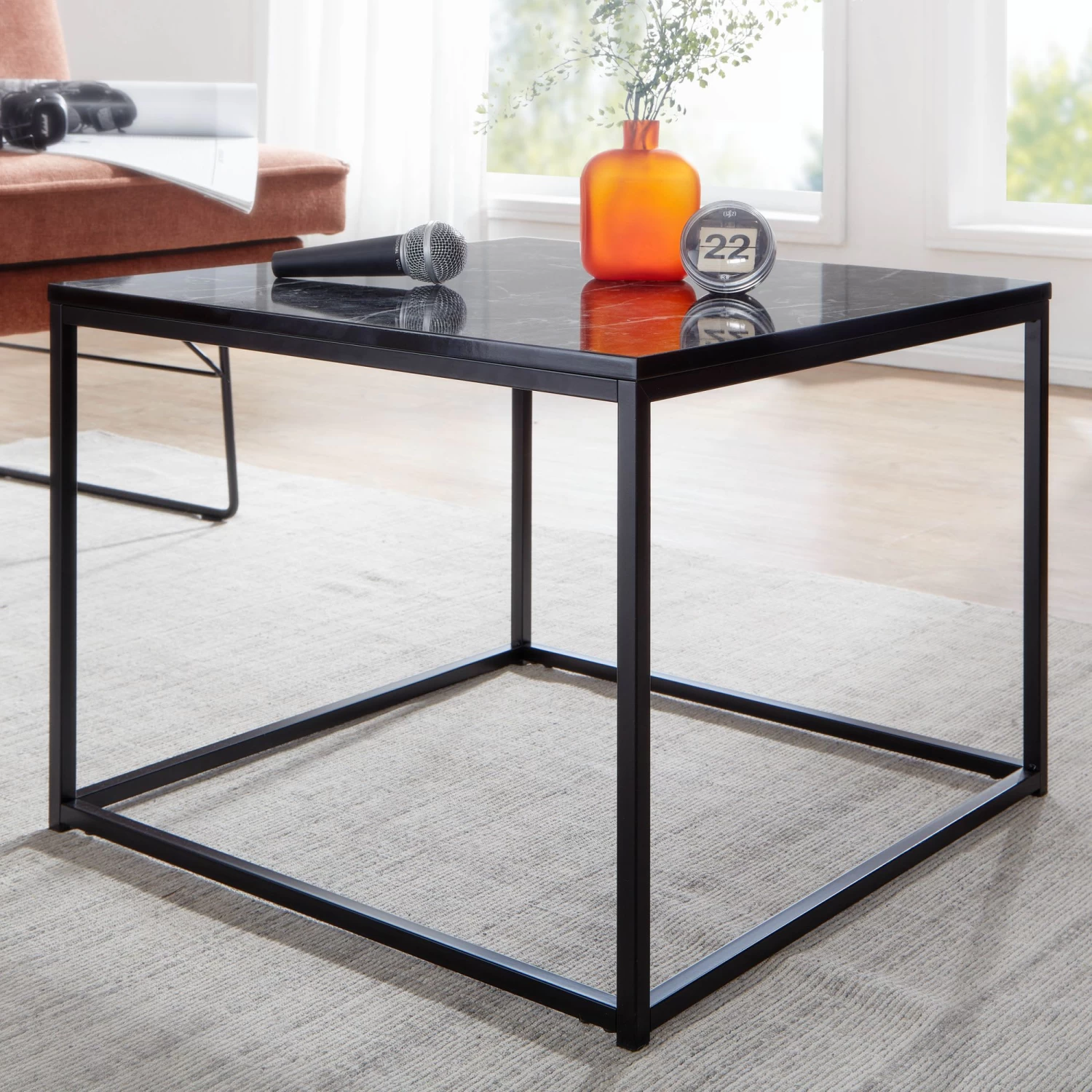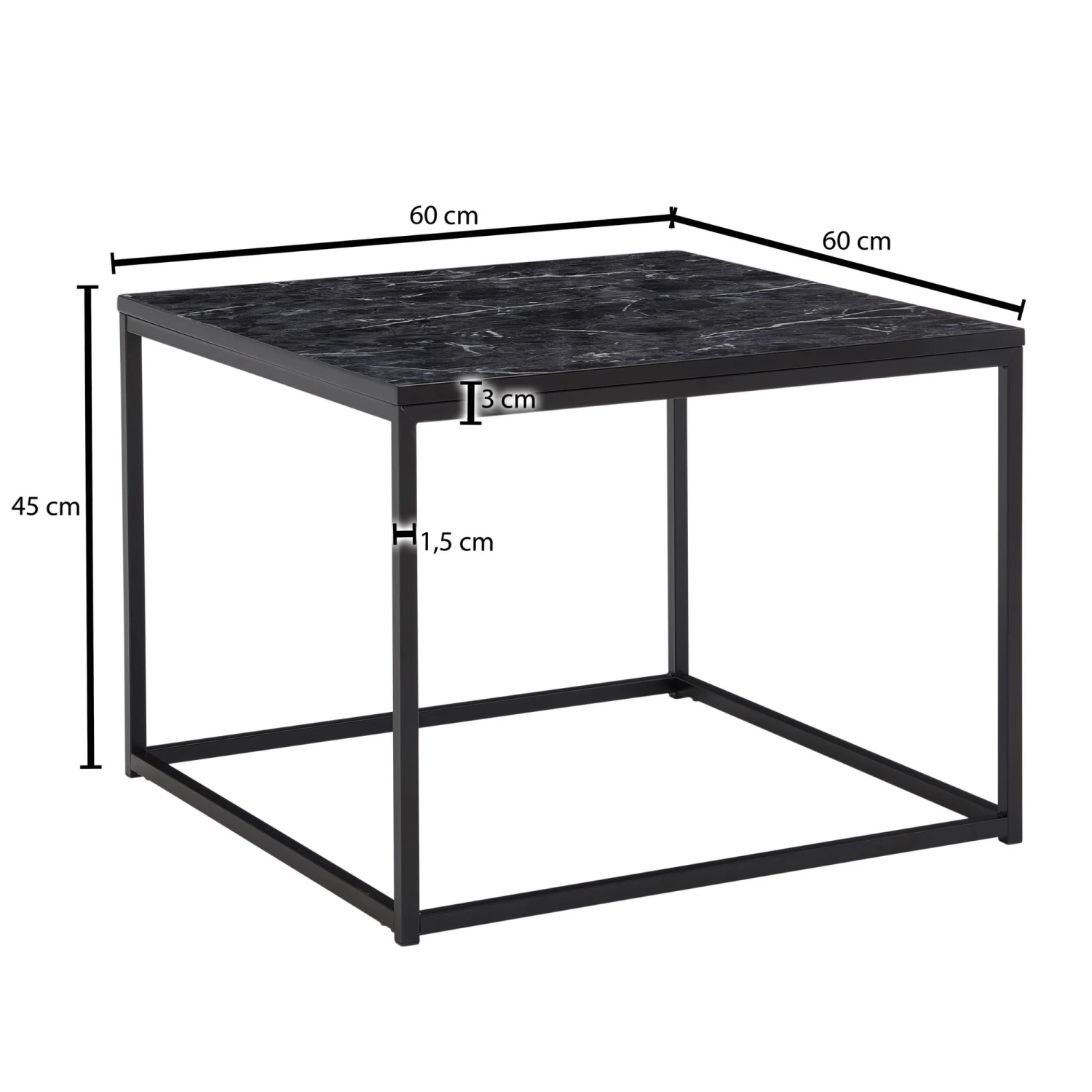 Design Quadratischer Sofatisch in modernem Design Tischplatte sticht durch die anmutige Marmor-Optik hervor Stylischer Wohnzimmertisch in angenehmer Farbkombination Moderner Kaffeetisch mit glänzenden Beinen Abmessungen Breite: 60 cm Tiefe: 60 cm Höhe: 45 cm Tischplattenstärke: 1,5 cm Weitere Abmessungen finden Sie im Maßbild Besonderheiten Sicherer Stand dank des robusten Metallgestells Aufgrund des Designs lässt sich der Tisch in vielen Zimmern einsetzen Edles Flair dank der Marmor-Optik Kunststoffkappen an den Beinen verhindern ein Verkratzen Ihres Bodens Empfohlene Maximalbelastbarkeit: 5 kg Material Tischplatte: foliertes MDF (mit Polyresin-Beschichtung) Gestell: lackierter Stahl Lieferumfang Ein Couchtisch ohne Dekoration Montageanleitung und -material liegen der Lieferung bei Montage Lieferzustand: demontiert und sicher verpackt Pflegehinweise Die Oberfläche mit einem lauwarm angefeuchteten Baumwolltuch reinigen. Keine Scheuermittel, scharfe Reinigungsmittel oder tropfnasse Tücher verwenden.