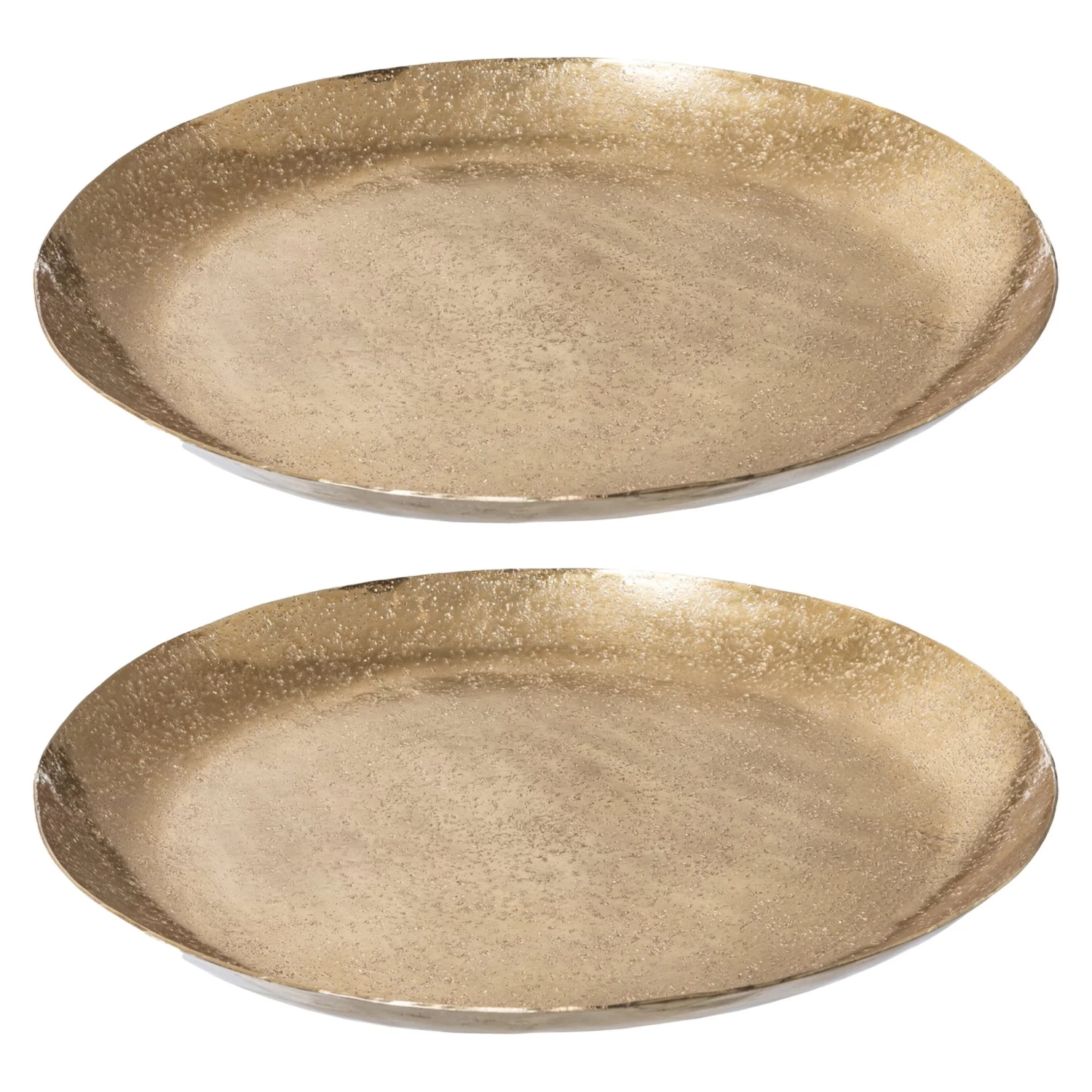 Die champagnerfarbenen Deko-Teller sind aufwendig aus Metall gearbeitet und eignen sich mit ihrem ca. 2cm hohen Rand auch pefekt als Kerzenteller oder Kerzentablett. Die Oberfläche ist bewusst unregelmäßig gestaltet und gibt den Dekotellern ihren besonderen Look. Du kannst das 2er Set ganz einfach in Deine Weihnachts- und Adventsdeko integrieren. Stell einen der Teller auf den Couchtisch und arrangiere ein paar Tannenzweige und Zapfen und ein Teelicht. Den anderen Teller kannst Du auf Deinen Esstisch stellen und z. B. Kerzen in verschiedenen Höhen darauf dekorieren. Noch ein paar Christbaumkugeln dazu gelegt und schon hast Du eine glänzende Tischdeko. Der Durchmesser der Teller beträgt 23 cm.