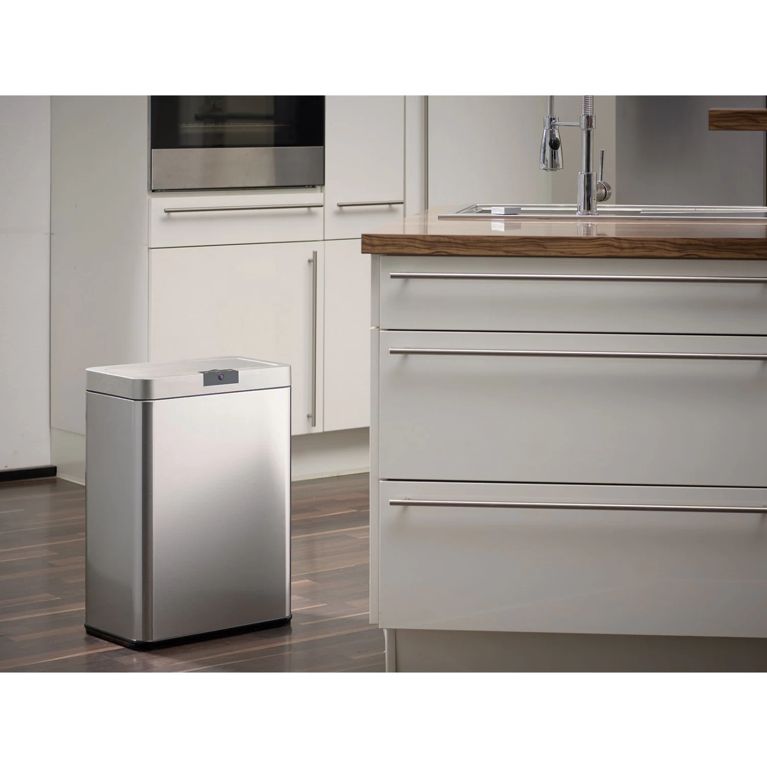 Der Echtwerk Abfalleimer „SQUARE“ kommt mit einem praktischen, um 90° drehbaren IR-Sensor. Durch das automatische Öffnen und Schließen mit der Soft Close Funktion kann der Mülleimer nur durch Bewegung bedient werden. Der Plastikring im inneren des Mülleimers fixiert den Müllbeutel, sodass kein Abfall daneben fällt.