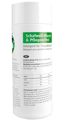 Lanolinhaltiges und somit rückfettendes Waschmittel für Lammfelle. Reinigt bedenkenlos alle Lammfellprodukte bei 30 Grad Schonwäsche. Verwenden Sie kein normales Waschmittel, denn es entzieht dem Fell das Fett. Das Leder hat eine Faserstruktur, die sich während des Trockenvorganges zusammenzieht. Es ist deshalb wichtig, die Lederseite im feuchten Zustand immer wieder in „Form“ zu ziehen und zu kneten, damit das Leder nicht hart wird.
