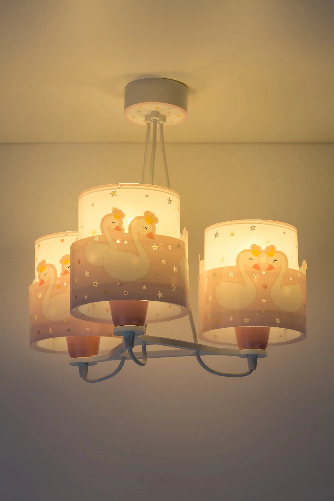 Diese süße Hängelampe erhellt jedes Kinderzimmer. Der Lampenschirm hat eine liebevolle Gestaltung mit einem niedlichen Schwanen-Motiv, welches im Dunkeln durch die fluoreszierenden Elemente ein seichtes Leuchten von sich gibt. Sorgen Sie mit der hübschen Lampe für einen Hingucker in Ihrem Zuhause, der sich in zahlreiche Raumgestaltungen problemlos einfügt.
