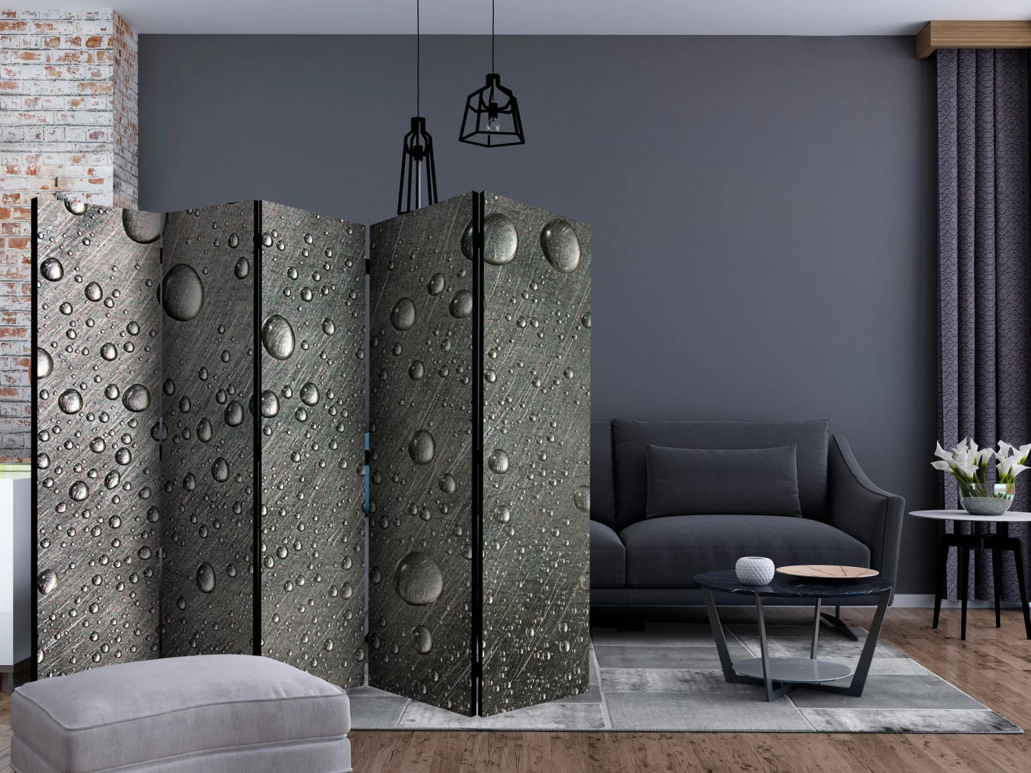 Dekoratives Paravent „Steel surface with water drops II [Room Dividers]“ ist ein besonderes Schmuckstück für die modernen Inneräume. 5-teilig, hergestellt aus Holz und beidseitig bedrucktes Paravent teilt nicht nur diskret den Raum sonder kreiert auch in dem Raum ein fabelhaftes Arrangement. Perfekte Herstellung sowie originelle Motive in der Full HD Druckqualität verursachen, dass die Zimmerparavents jedem Raum einen einmaligen Charme verleihen. Die dekorativen Paravents für die Wohnung, dass ist mit Sicherheit eine originelle Idee für die Dekoration des Innenraumes. Es lohnt sich ihre praktische Anwendung zu erwähnen – die Zimmerparavents kann man z.B. zwecks der Kachierung des Wäschetrockners nutzen. Das Paravent ist eine sehr originelle Dekoration von Räumen, die man nutzen kann, sowohl in der Wohnung wie auch in einem Atelier z.B. im Friseursalon, Arztpraxis oder im Buchhaltungsbüro. Dekoratives Paravent bewährt sich ideal als:Als Zimmerparavent und ein dekoratives Möbelstück, dass den großen Salon vom Speisezimmer und Küche trenntIn einer Ein-Zimmer-Wohnung, in dem es den Tagesraum vom Schlafzimmer trenntAls Paravent für das Schlafzimmer, in dem es z.B. die Kleingarderobe heraustrenntIn Boutiquen und Kosmetiksalons, als orignelles Arrangement und Umkleideraum in Einem!Im gemeinsamen Geschwisterzimmer, als diskrete Trennwand für den RaumIn grossen Wohnungen und Lofts Technische Daten: