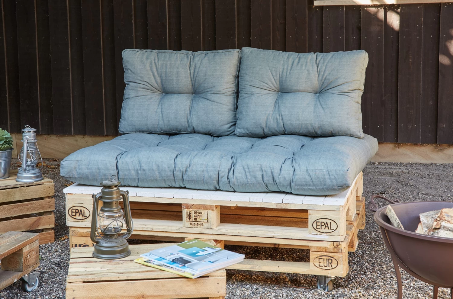 Selbstgebaute Palettenmöbel sind derzeit im Trend und lassen sich mit den Palettenkissen-Set optimal aufwerten.