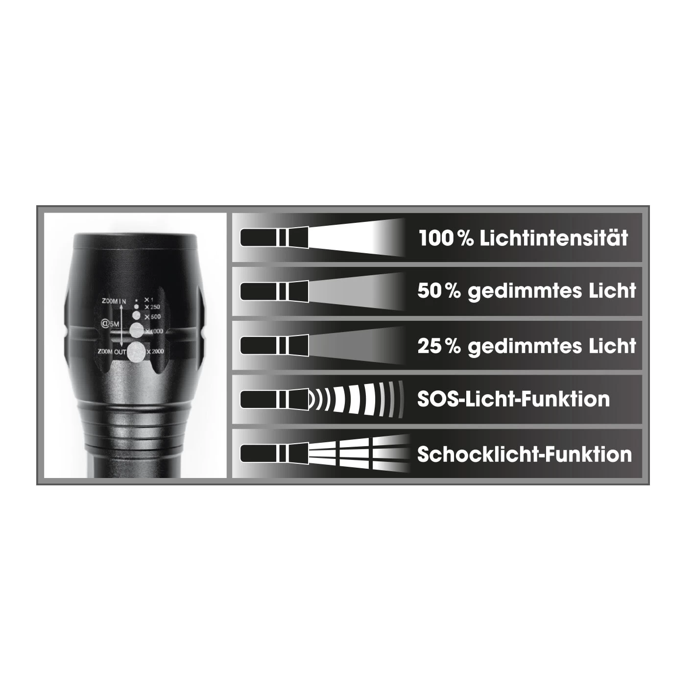 – Hinweise: Der Artikel ist zur Verwendung als Taschenlampe geeignet und verfügt über eine Zoomfunktion sowie über 5 verschiedene Modi (25 %, 50 %, 100 %, Flash, SOS). Der Artikel ist kein Spielzeug!