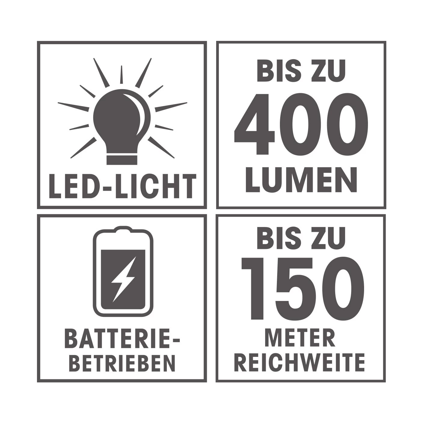 Ihr idealer Begleiter im Alltag und in jeder Lebenslage: Die ‚EASYmaxx‘ Power-Funktionstaschenlampe leuchtet bis zu 40 x heller als herkömmliche Taschenlampen und erzeugt einen strahlend hellen Lichtkegel. Die Lichtkegel-Intensität ist schnell und stufenlos einstellbar und daher für jeden Bedarf geeignet. Das Licht der handlichen, kompakten und sehr robusten Taschenlampe ist sogar aus weiter Entfernung klar sichtbar – ideal auch bei Ausflügen in einsamere Gebiete. Darüber hinaus verfügt die ‚EASYmaxx‘ Power-Funktionstaschenlampe über 5 Leuchtmodi. Hier können Sie zwischen leichter, mittlerer oder starker Lichtintensität wählen und im Notfall sogar ein SOS-Signal senden. Eine weitere Besonderheit der ‚EASYmaxx‘ Power-Funktionstaschenlampe ist die Schocklicht-Funktion: Diese speziell für Ihre Sicherheit entwickelte Einstellung hält durch extrem blendendes und blinkendes Licht unerwünschte Personen fern. Die ‚EASYmaxx‘ Power-Funktionstaschenlampe bietet Ihnen höchste Lichtqualität für alle Fälle!