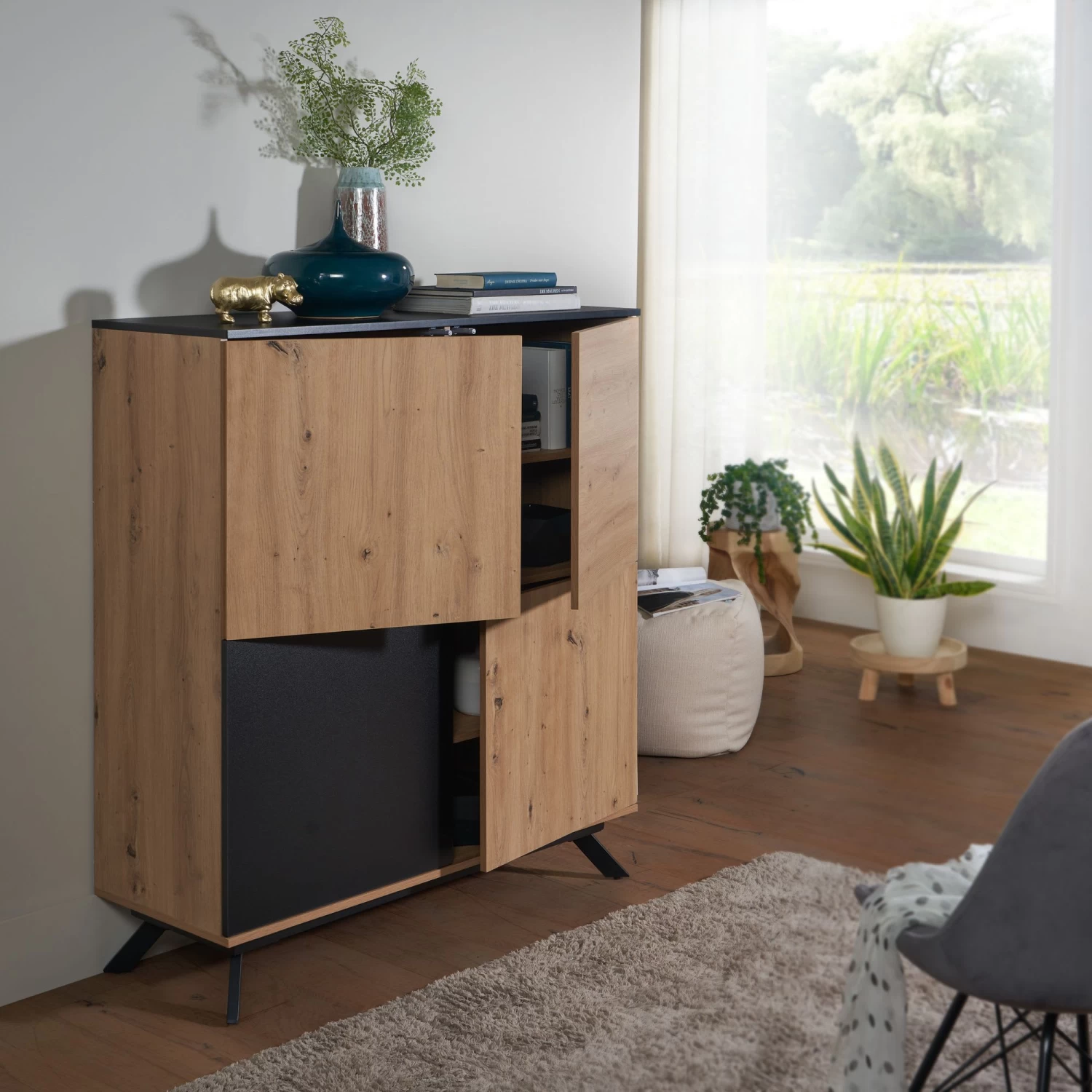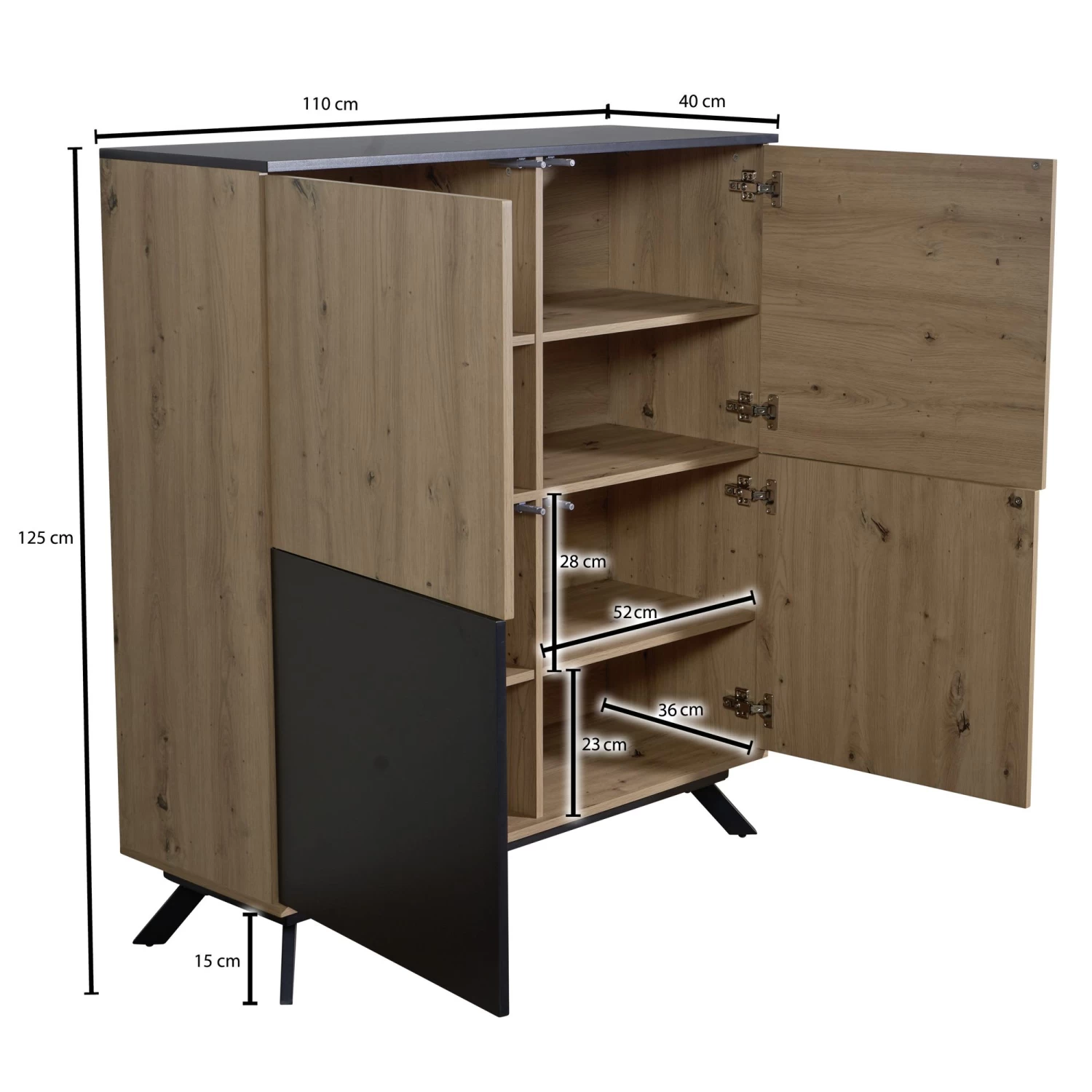 Design Stilvolle Kommode in modernem Design Insgesamt acht Fächer hinter den vier Türen sorgen für Stauraum Harmonische Kombination aus Eiche-Dekor und Schwarz Vier robuste Standbeine für sicheren Stand Abmessungen Breite: 110 cm Höhe: 125 cm Tiefe: 40 cm Innenmaße kleine Fächer (BxHxT): 52 x 23 x 36 cm Innenmaße große Fächer (BxHxT): 52 x 28 x 36 cm Bodenfreiheit: 15 cm Materialstärke: 1,5 cm Farbe Korpus und drei Türfronten: Eiche Eine Türfront, oberste Platte und Beine: Schwarz Besonderheiten Die Türfächer und die Ablage bieten Ihnen viel Platz für die Unterbringung unterschiedlichster Dinge Zwei Einlegeböden lassen sich jeweils auf drei verschiedenen Höhen verstellen Magnetstopper an den grifflosen Türen verhindern, dass sich diese nicht ungewollt öffnen Kratzfeste Oberfläche dank der Melaminharzbeschichtung Durch das Melamin ist die oberste Platte zudem wasserabweisend Anti-Rutsch-Noppen schützen Ihren Fußboden und das Metall vor unschönen Kratzern Durch das Design lässt sich die Kommode in vielen Räumen einsetzen (z.B. Flur, Küche, Wohnzimmer…) Empfohlene Maximalbelastbarkeit: 50 kg Material Oberste Platte: foliertes MDF mit Melaminharzbeschichtung Korpus: foliertes MDF Beine: pulverbeschichtetes Eisen Lieferumfang Ein Highboard ohne Dekoration Montageanleitung und -material liegen der Lieferung bei Montage Lieferzustand: demontiert und sicher verpackt Pflegehinweise Die Oberfläche mit einem lauwarm angefeuchteten Baumwolltuch reinigen. Keine Scheuermittel, scharfe Reinigungsmittel oder tropfnasse Tücher verwenden.