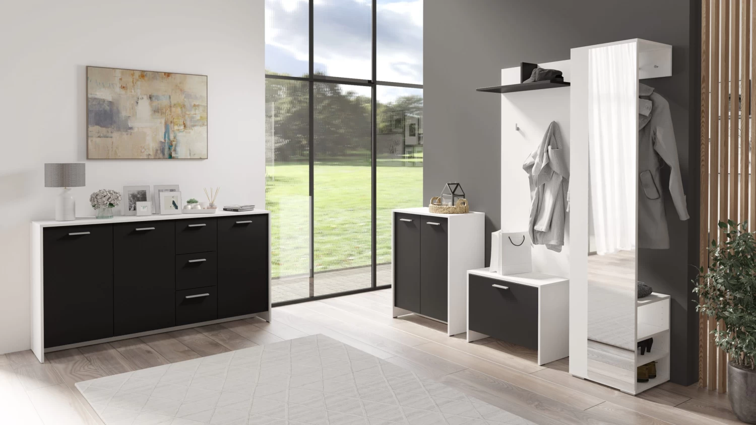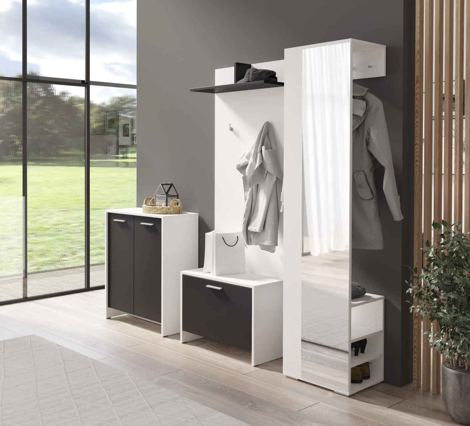 Passend zu der Sitzbank gibt es tolle weitere Möbel die das Design ihres Raumes abrunden, wie zum Beispiel einen Hochschrank mit Spiegel, ein Wandpaneel, einen Schuhschrank und ein Sideboard.