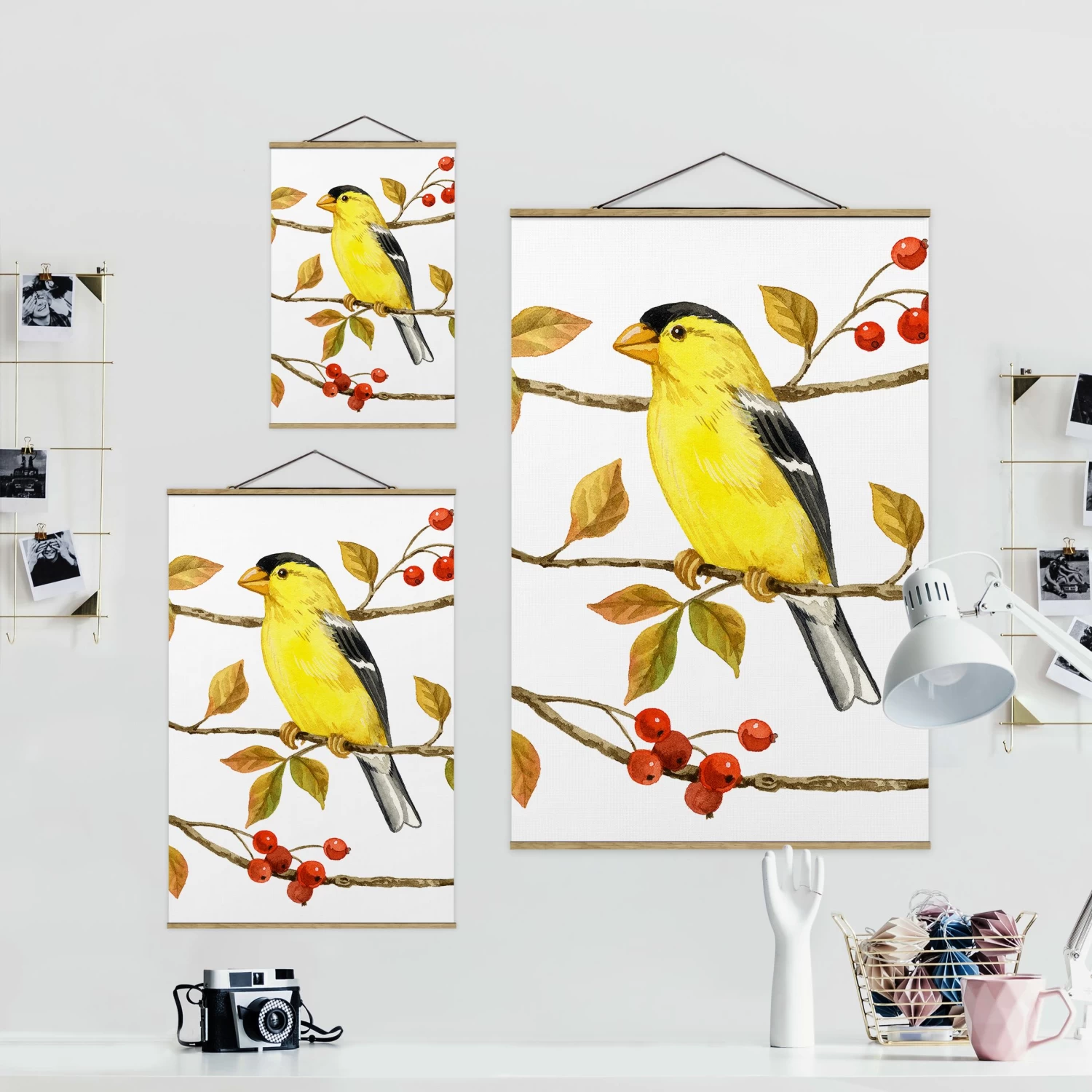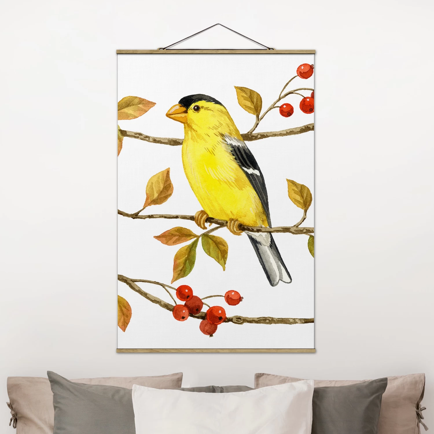 Stoffbild Mit Posterleisten – Vögel Und Beeren – Goldzeisig In Weiß