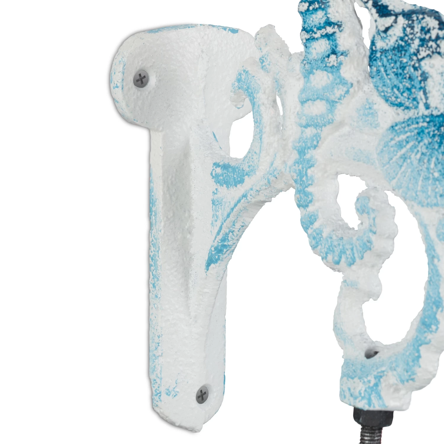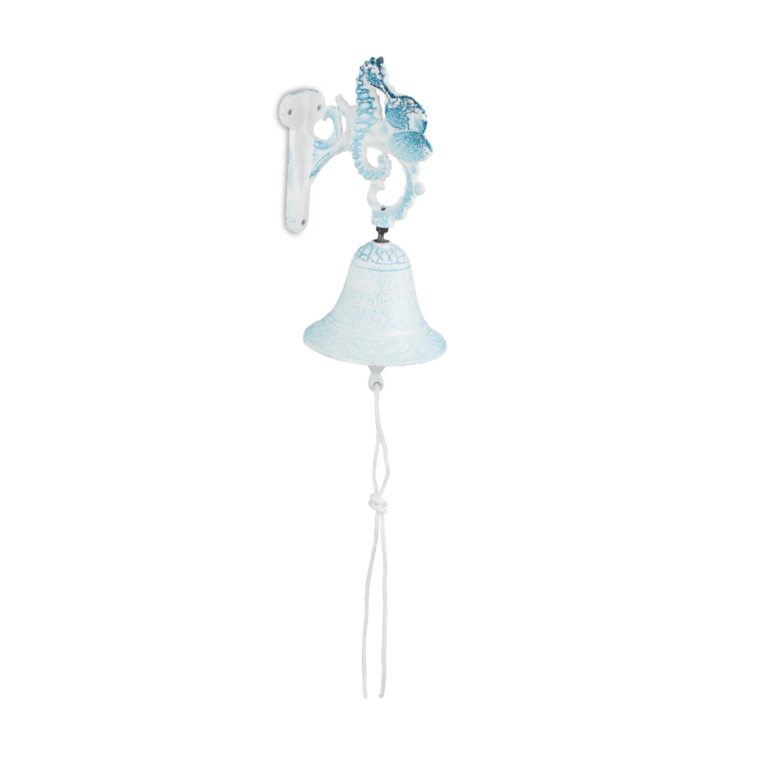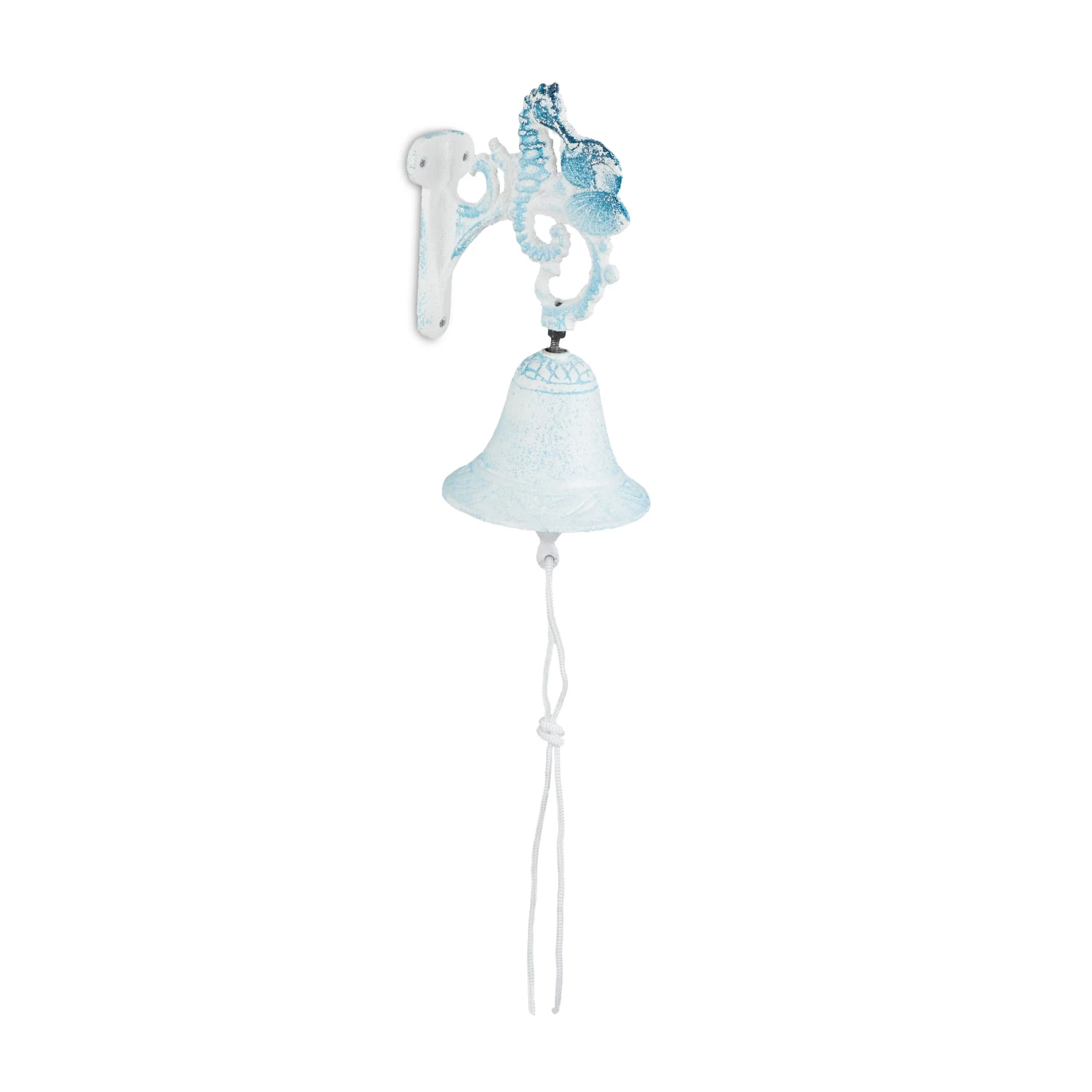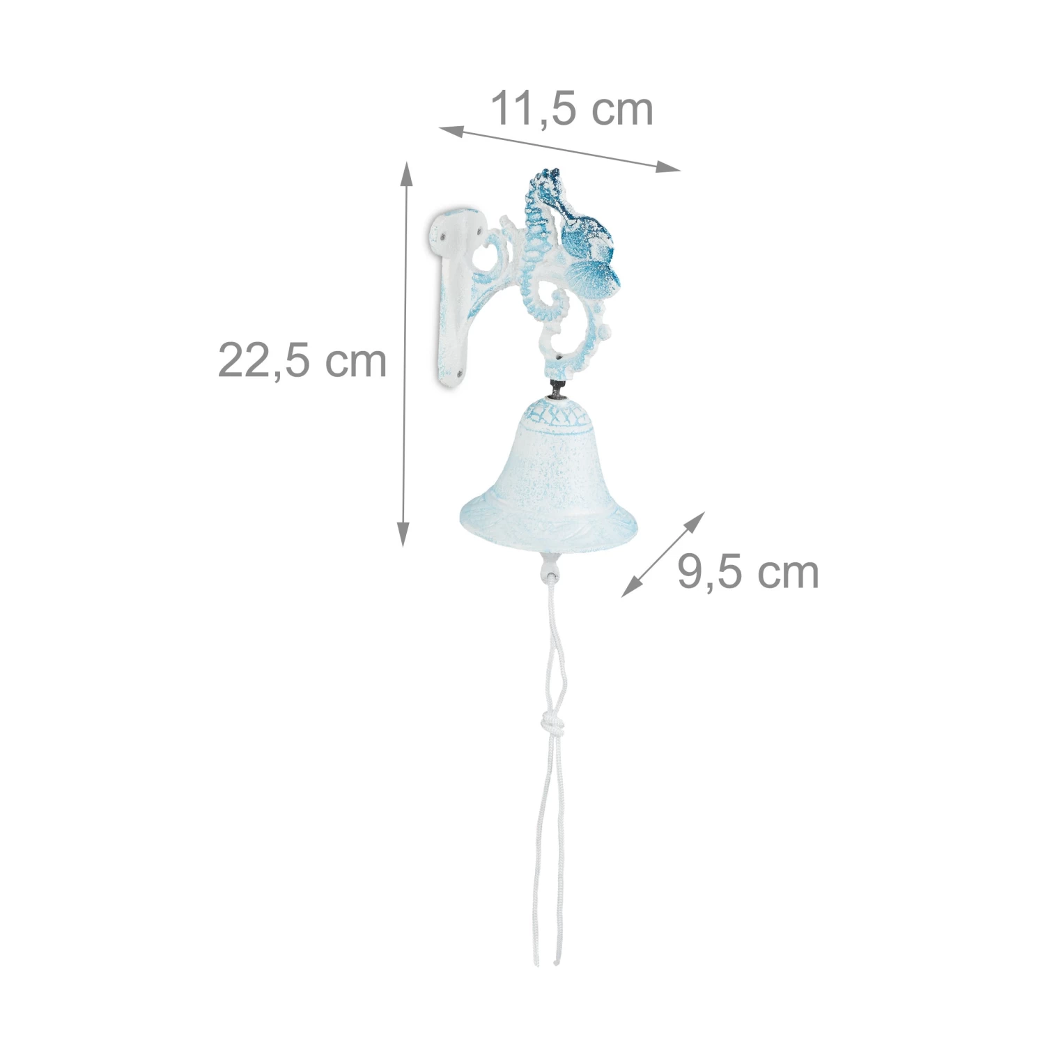 Ahoi! Wenn Du Dich auch daheim wie auf hoher See fühlen willst, ist die Türglocke im maritimen Design genau das Richtige für Dich. Ob als ausgefallener Empfang an der Haustür für die Gäste oder als robuste Deko im Garten, die Schiffsglocke mit dem Seepferdchen und den Muscheln wird überall zum Eyecatcher. Die Fertigung aus Gusseisen macht sie besonders robust und dank des Klöppels erzeugt sie einen lauten, hellen Klang. Die blau-weiße Metallglocke ist schnell an der Wand montiert.
