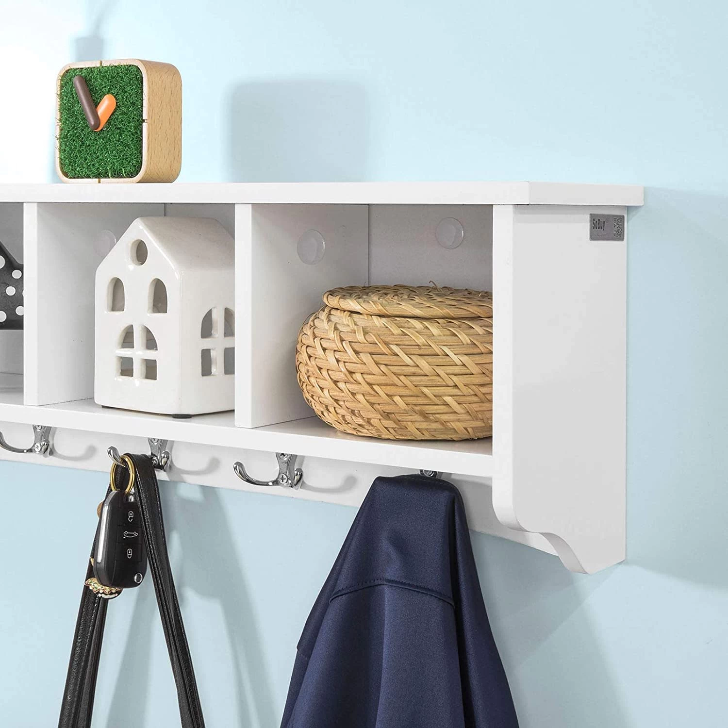 Außerdem könnten die fünf Haken als Aufhängungsmöglichkeit für Jacken, Handtücher oder Geschirrtücher benutzt werden.