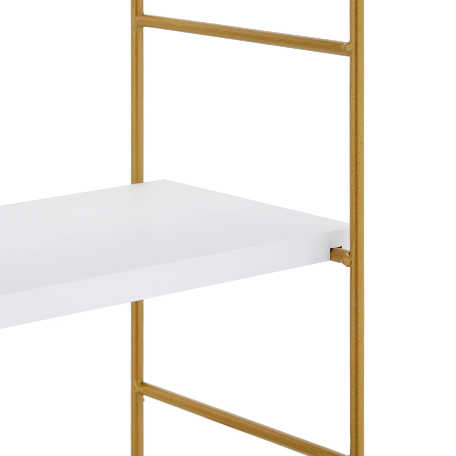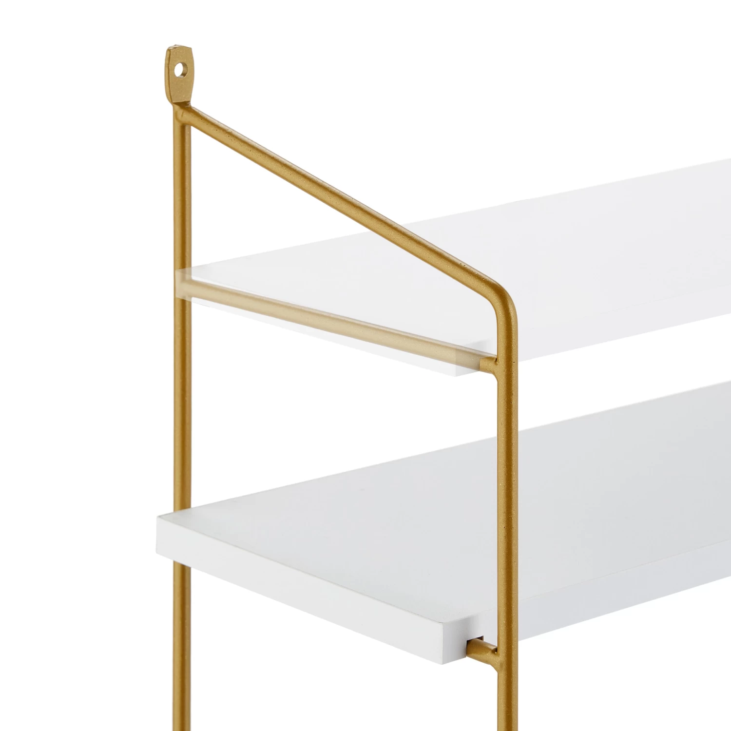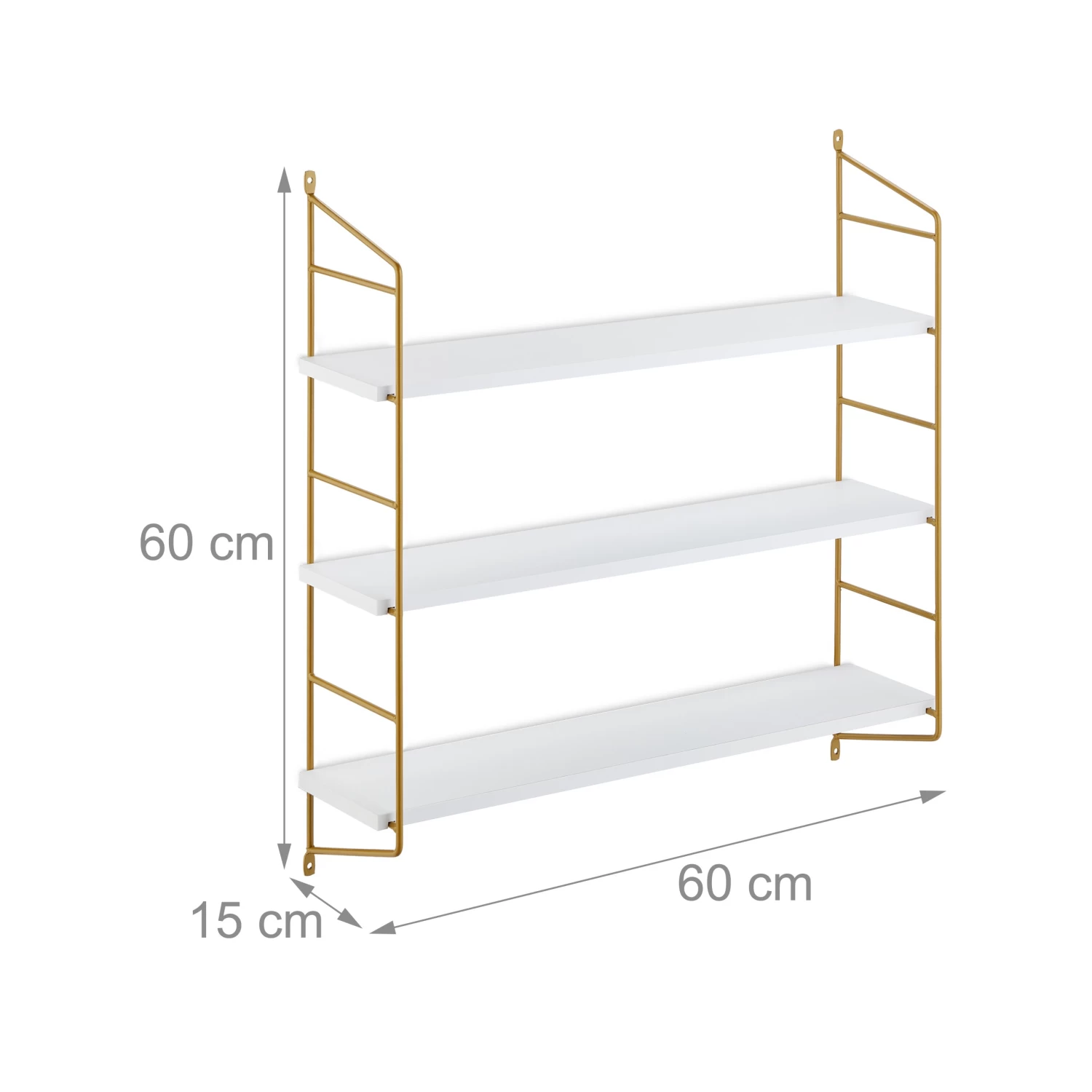 Dieses Wandregal haucht Deinen leeren Wänden im Wohn- oder Schlafzimmer neues Leben ein. Kleine Pflanzen, Bilder und Dekofiguren finden auf den 3 Ablagen einen tollen Platz an der Wand und werden dekorativ in Szene gesetzt. Auch in Flur oder Küche, wo sich das Schweberegal etwa für Gewürze eignet, fügt sich das Hängeregal perfekt ein. Durch die geschickte Kombination aus goldenen Rahmen und weißen Ablageflächen holst Du Dir mit der Wandablage einen zeitlosen und angesagten Look nach Hause.