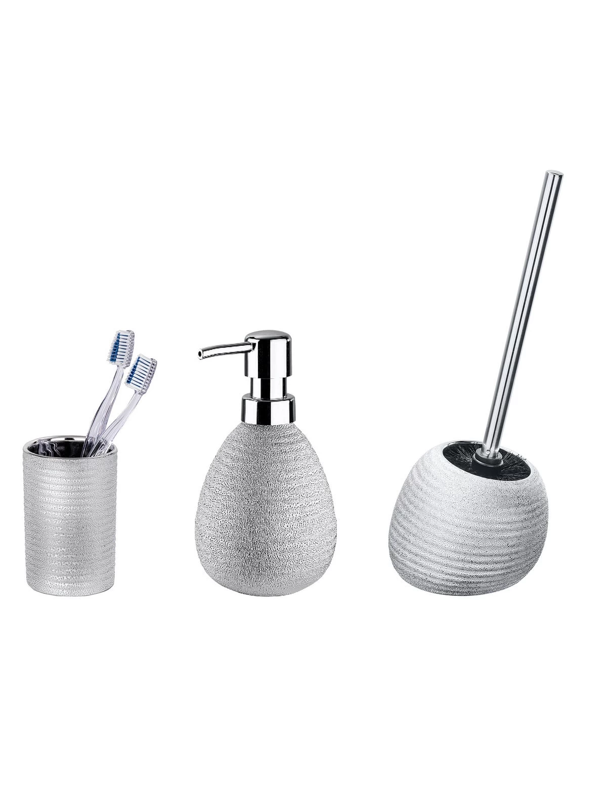 Aller guten Dinge sind drei! Deshalb erhalten Sie im praktischen 3er Set einen Zahnputzbecher, einen Seifenspender und eine WC-Garnitur der eleganten Badserie Polaris Juwel.