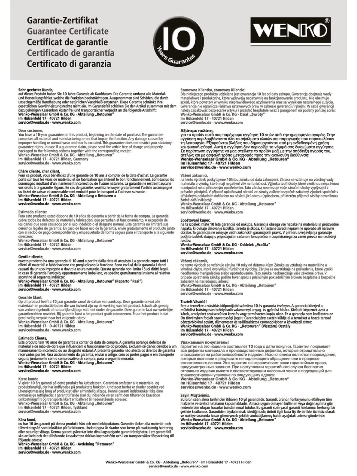 Auf dieses Produkt haben Sie 10 Jahre Garantie ab Kaufdatum. Die Garantie umfasst alle Material- und Herstellungsfehler, welche die Funktion beeinträchtigen. Ausgenommen sind Schäden, die durch unsachgemäße Handhabung oder natürlichen Verschleiß entstehen. Diese Garantie schränkt Ihre gesetzlichen Gewährleistungsrechte nicht ein. Im Garantiefall schicken Sie den Artikel zusammen mit dem dazugehörigen Kassenbon kostenfrei und transportsicher verpackt an die folgende Anschrift: Wenko-Wenselaar GmbH & Co. KG · Abteilung „Retouren“ Im Hülsenfeld 17 · 40721 Hilden [email protected]