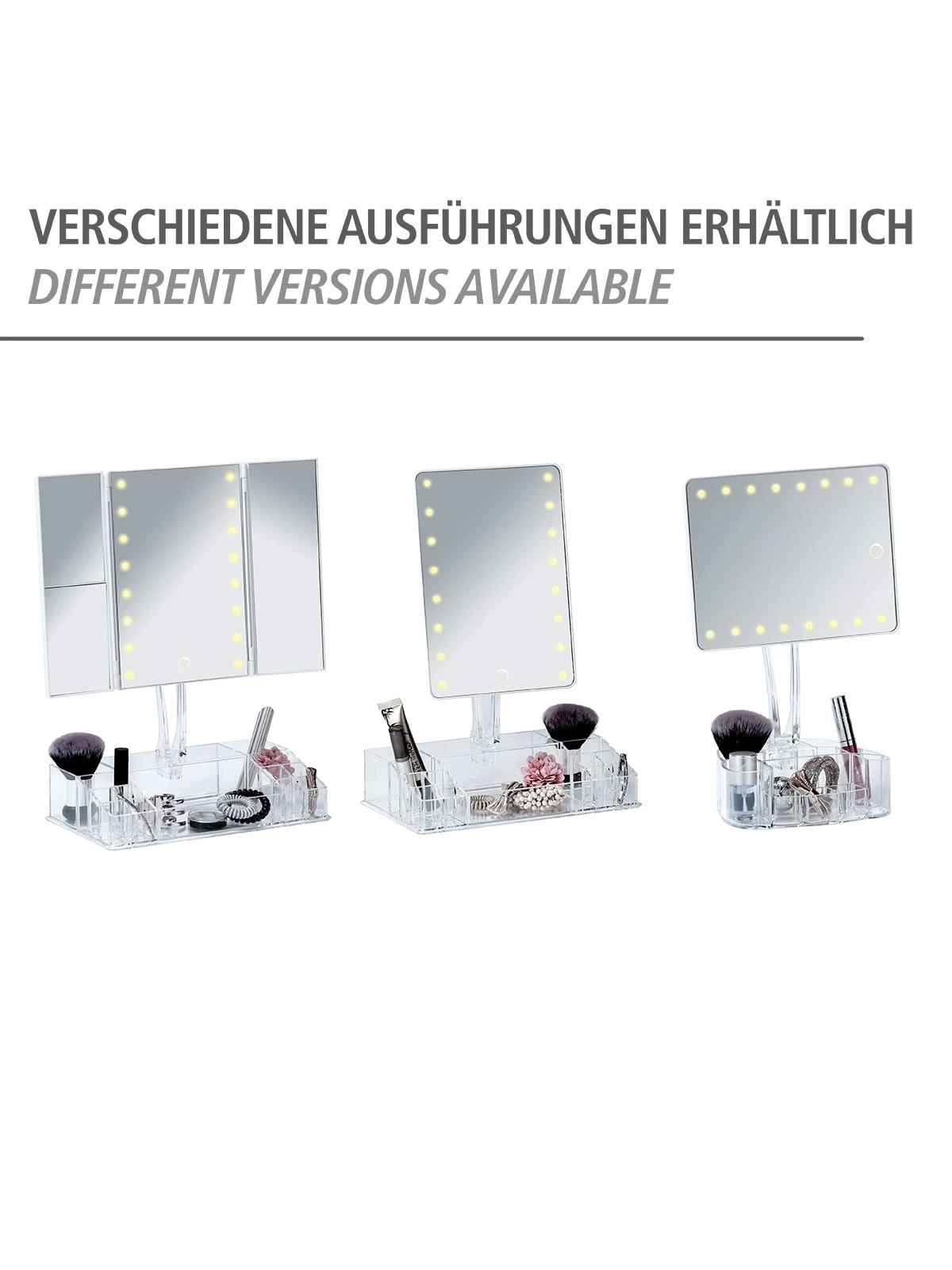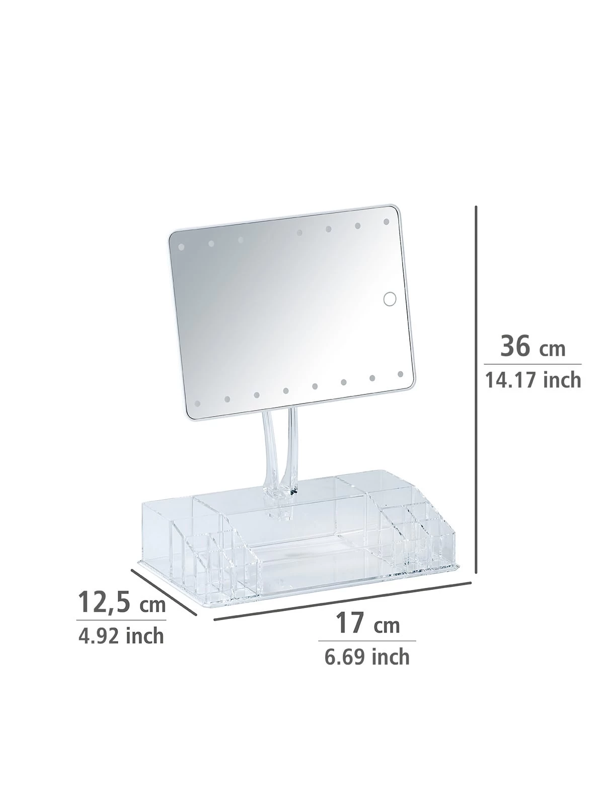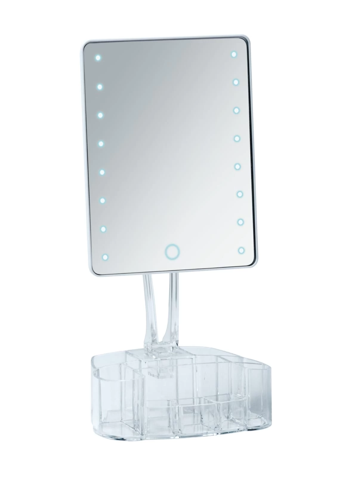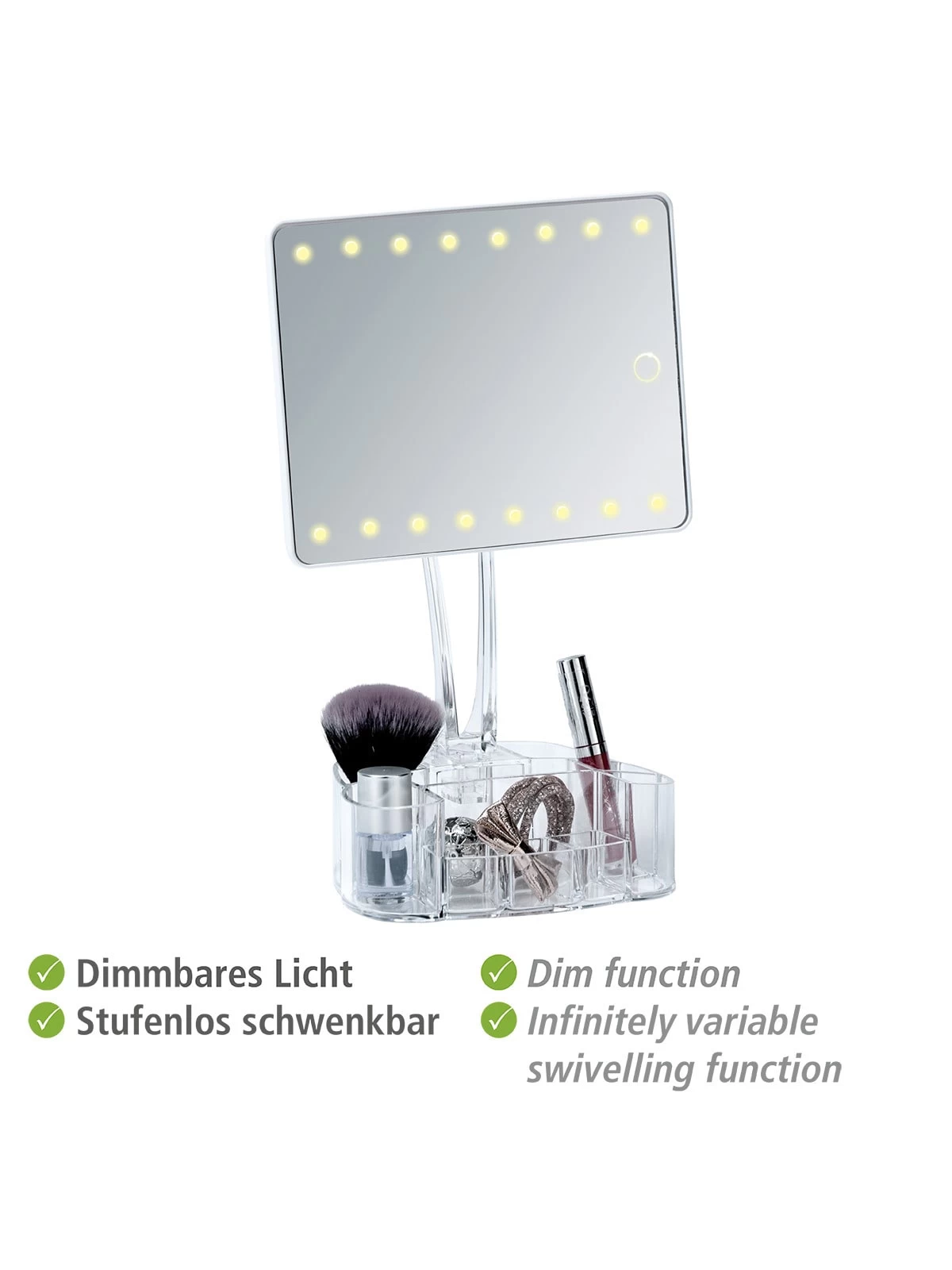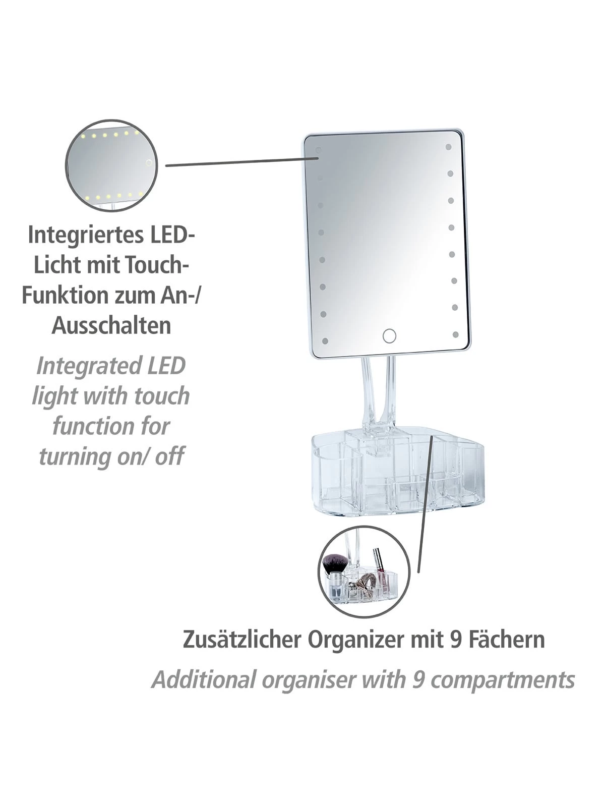 Besonders praktisch: Der Standfuß ist zugleich ein praktischer Organizer mit neun Fächern für z.B. Lippenstifte, Make-up, Pinsel und Nagellack. Dort können auch Spangen und Pflegeprodukte ordentlich platziert und organisiert werden.