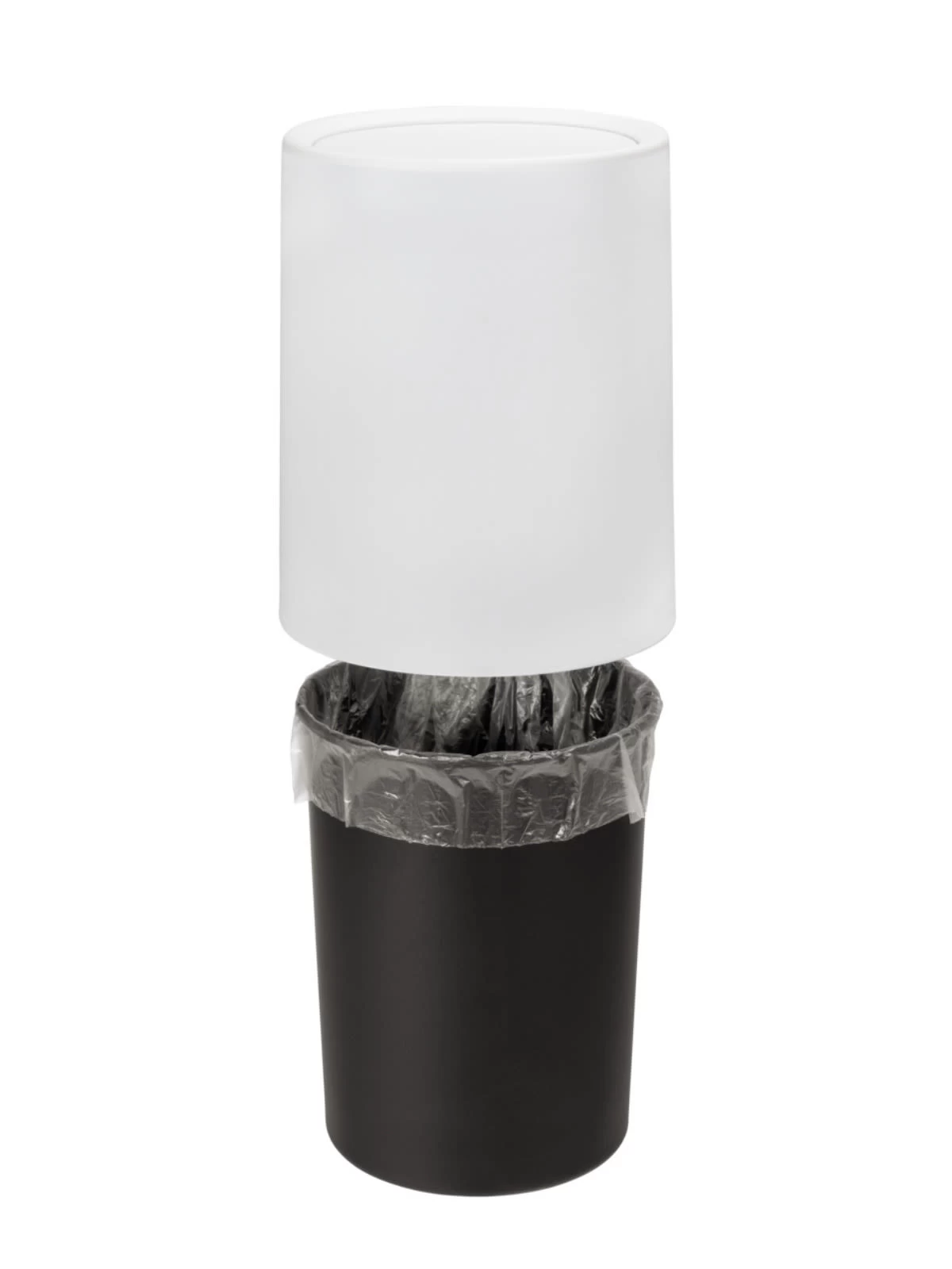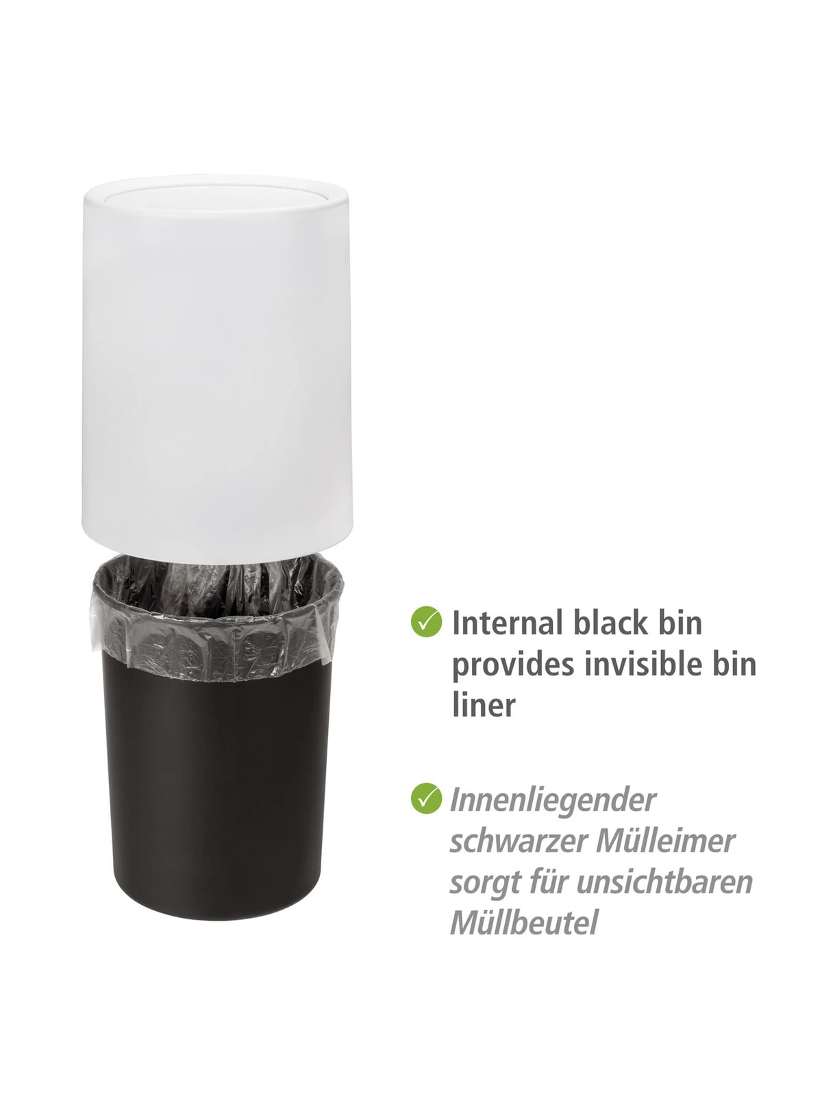 Der innenliegende schwarze Mülleimer kann wie üblich mit einem Beutel befüllt werden, die Hülle inklusive Schwingdeckel wird dann einfach übergestülpt und der Müllbeutel ist verschwunden. Außen ist der Beutel komplett unsichtbar. Zum Entnehmen voller Müllbeutel wird der Außeneimer ganz leicht wieder abgenommen.