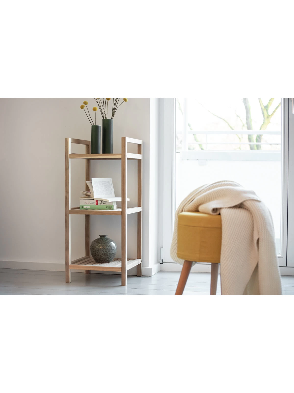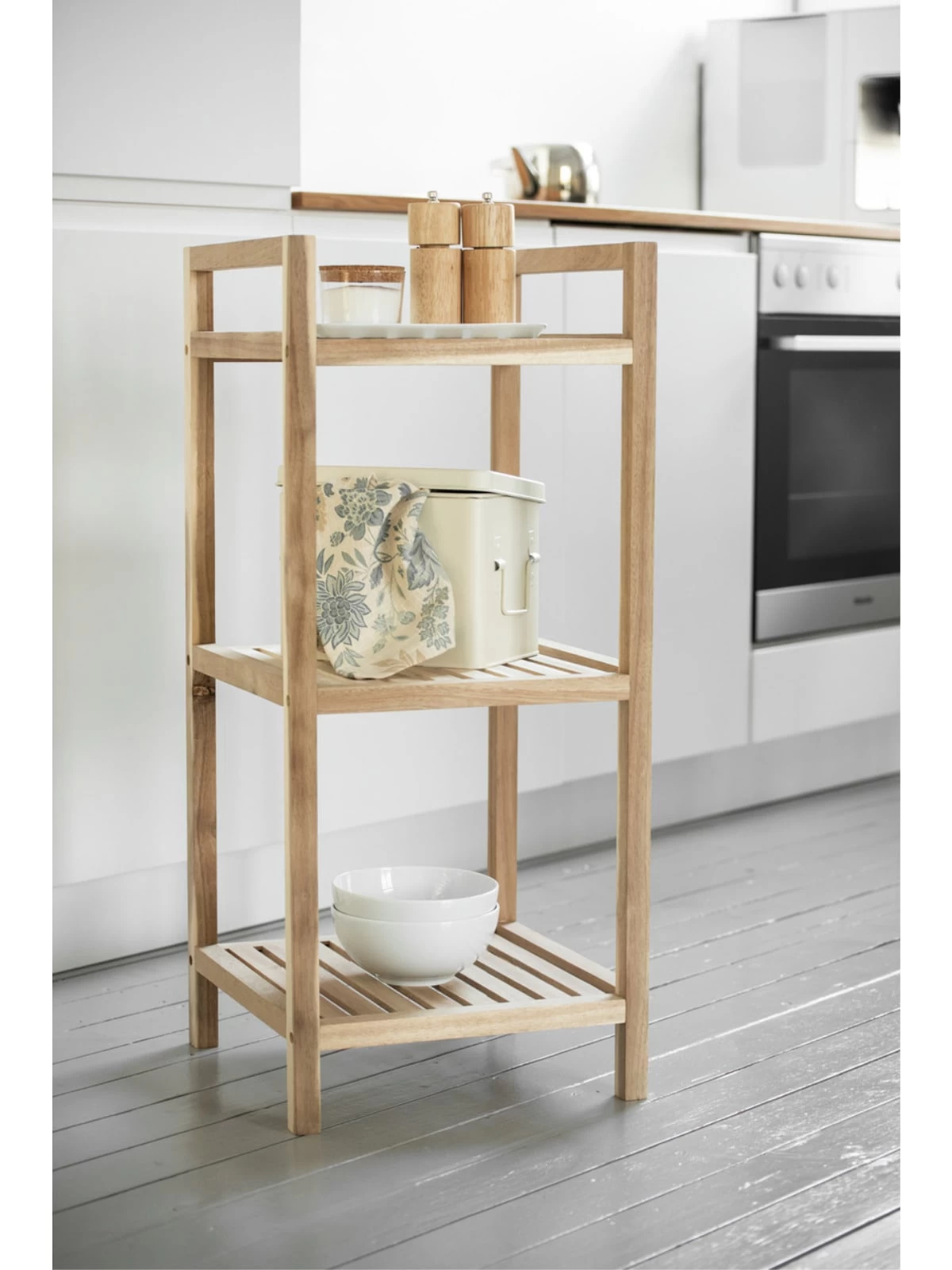 Das attraktive Wohnregal Acina bietet mit seinen drei Regalböden viel Platz für Handtücher, Bücher, Küchenutensilien, Accessoires und Dekoration. Egal, wo Sie das charmante Haushalts- und Badregal platzieren, ob im Bad, Schlafzimmer, Flur, in der Küche oder im Wohnzimmer – das praktische Standregal macht immer eine gute Figur und ist vielseitig einsetzbar.